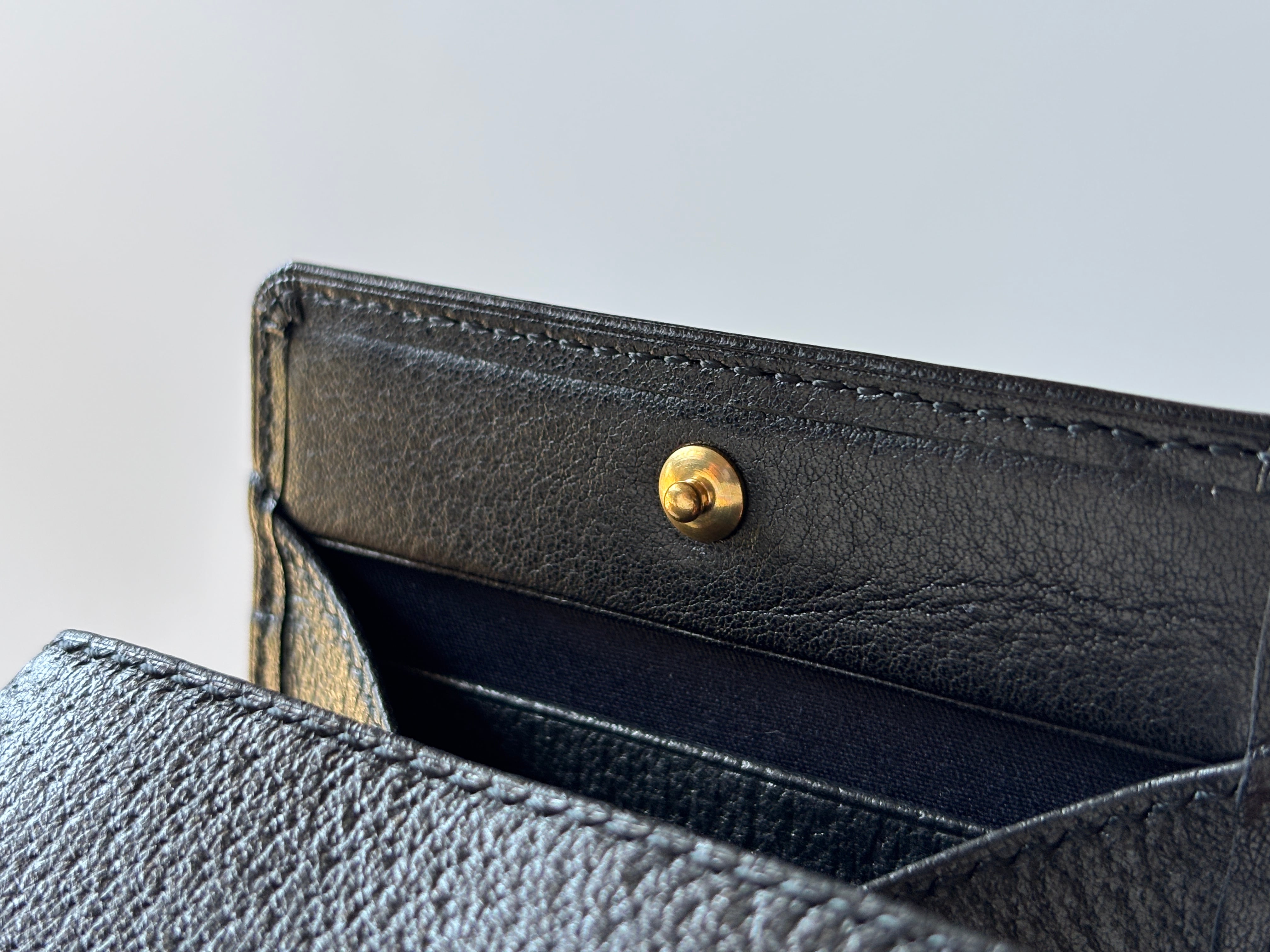 内部には三つ折り紙幣を差し込める専用札ホルダーを、背面にはICカードやカードキーを1枚収める隠しポケットを配置。これひとつで街へ出られる「機動力」を追求しました。イタリア・プリム社製の真鍮ホックが鳴らす「パチン」という小気味よい響きが、日常の何気ない動作に心地よいリズムを与えてくれます。