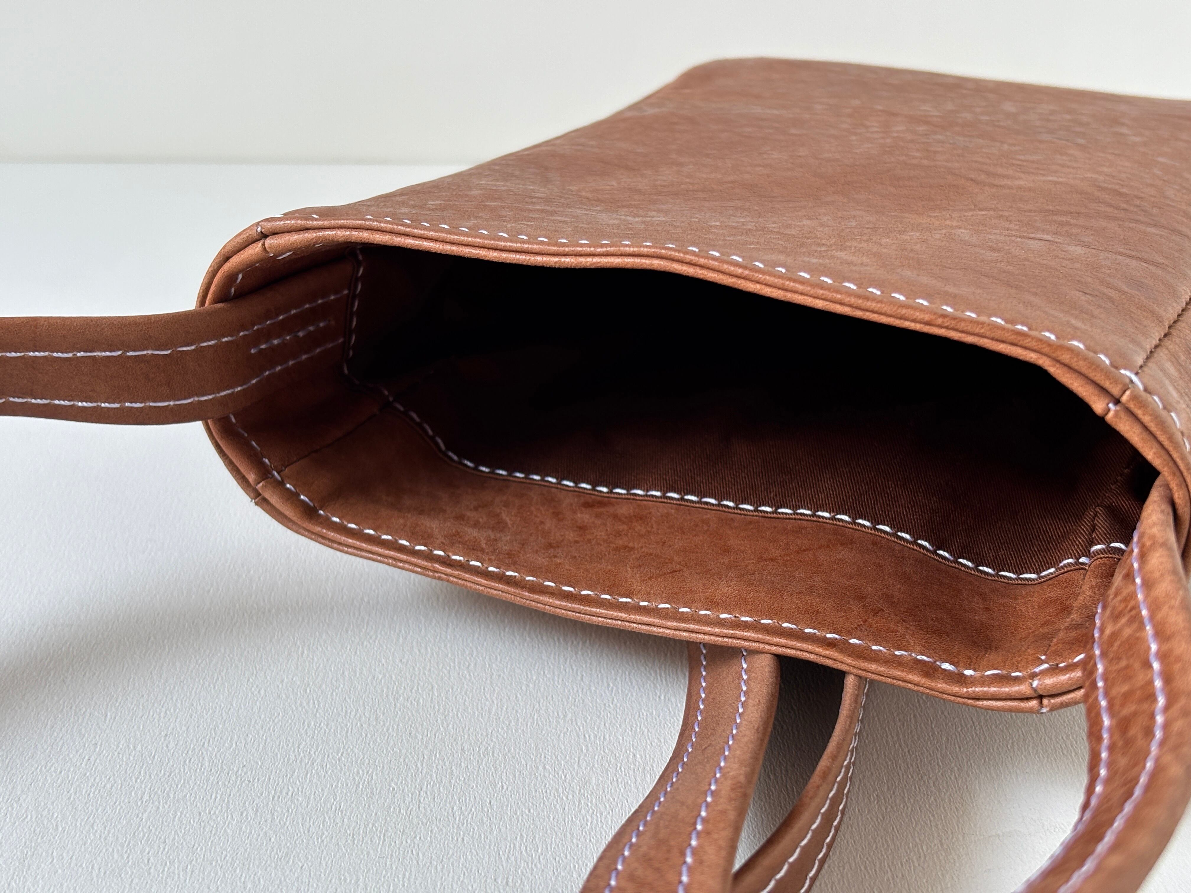 ・耐久性に優れた構造:内部と底に芯材を使用し、型崩れ防止と耐久性を強化。肩ストラップは一枚革で仕上げ、伸び止めテープを挟み込み強度と確保。