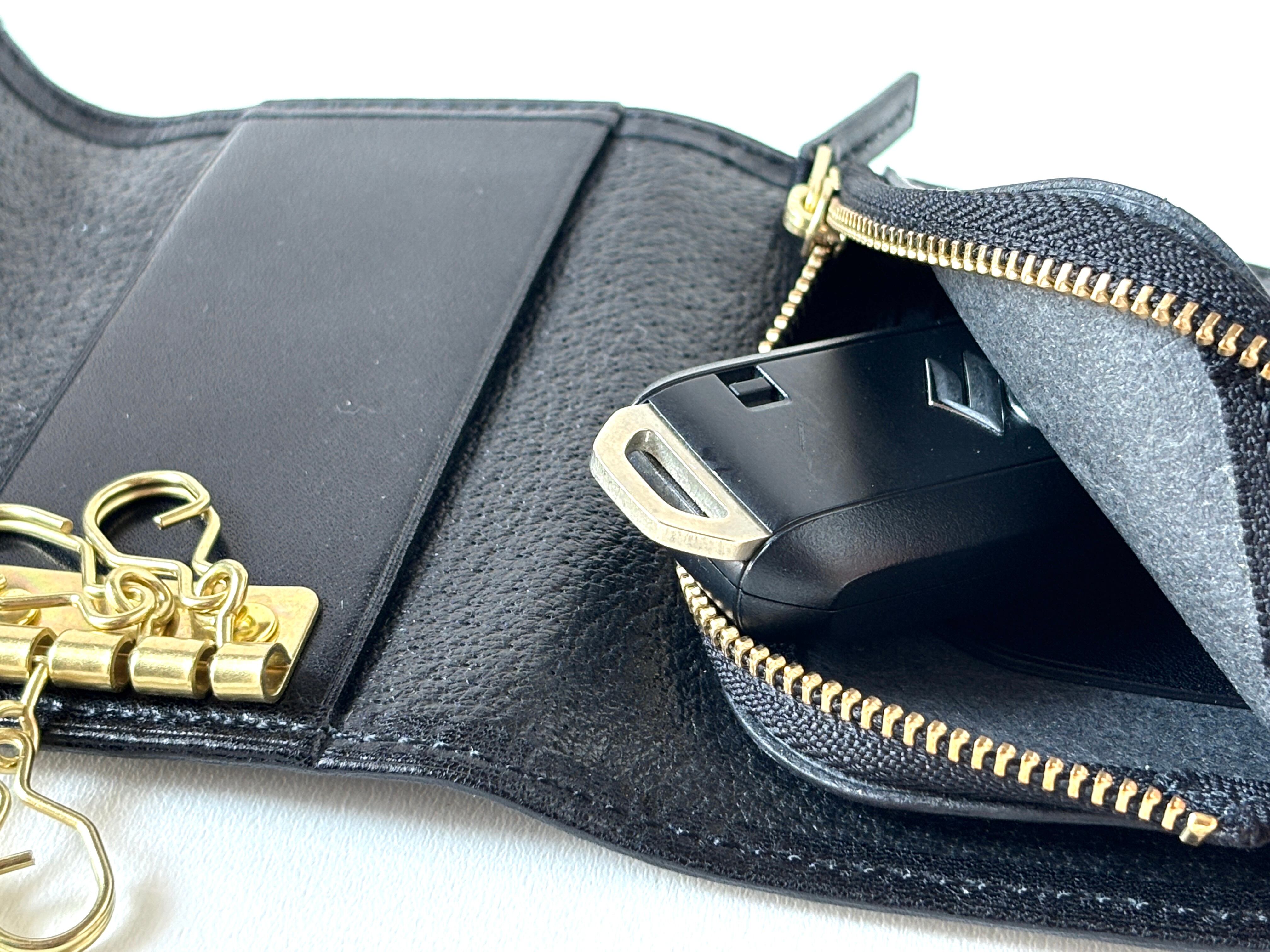・オールインワン収納:ファスナー内には仕切りを設けることで、スマートキーに加えアップルタグなども収納できる設計になっています。