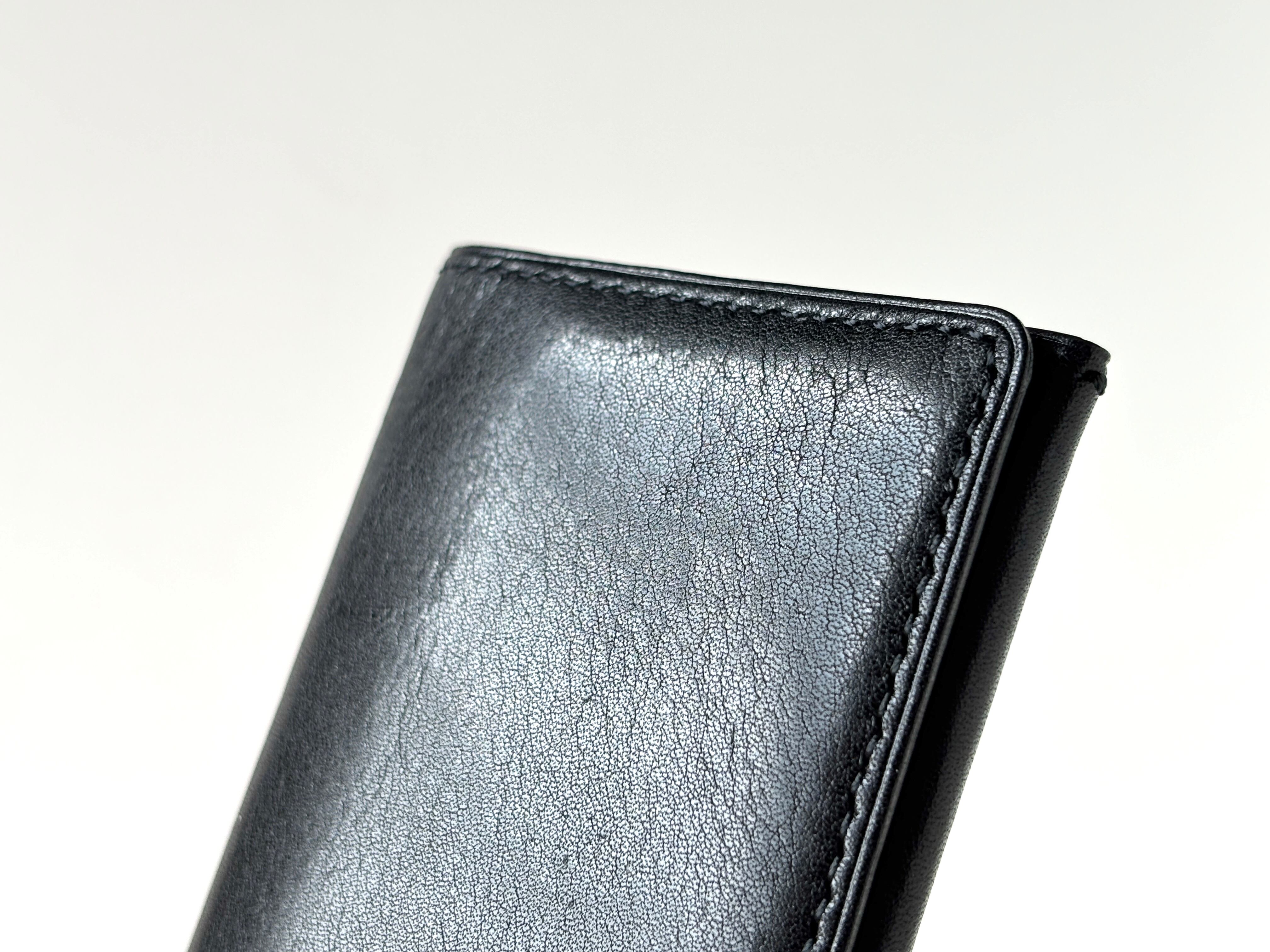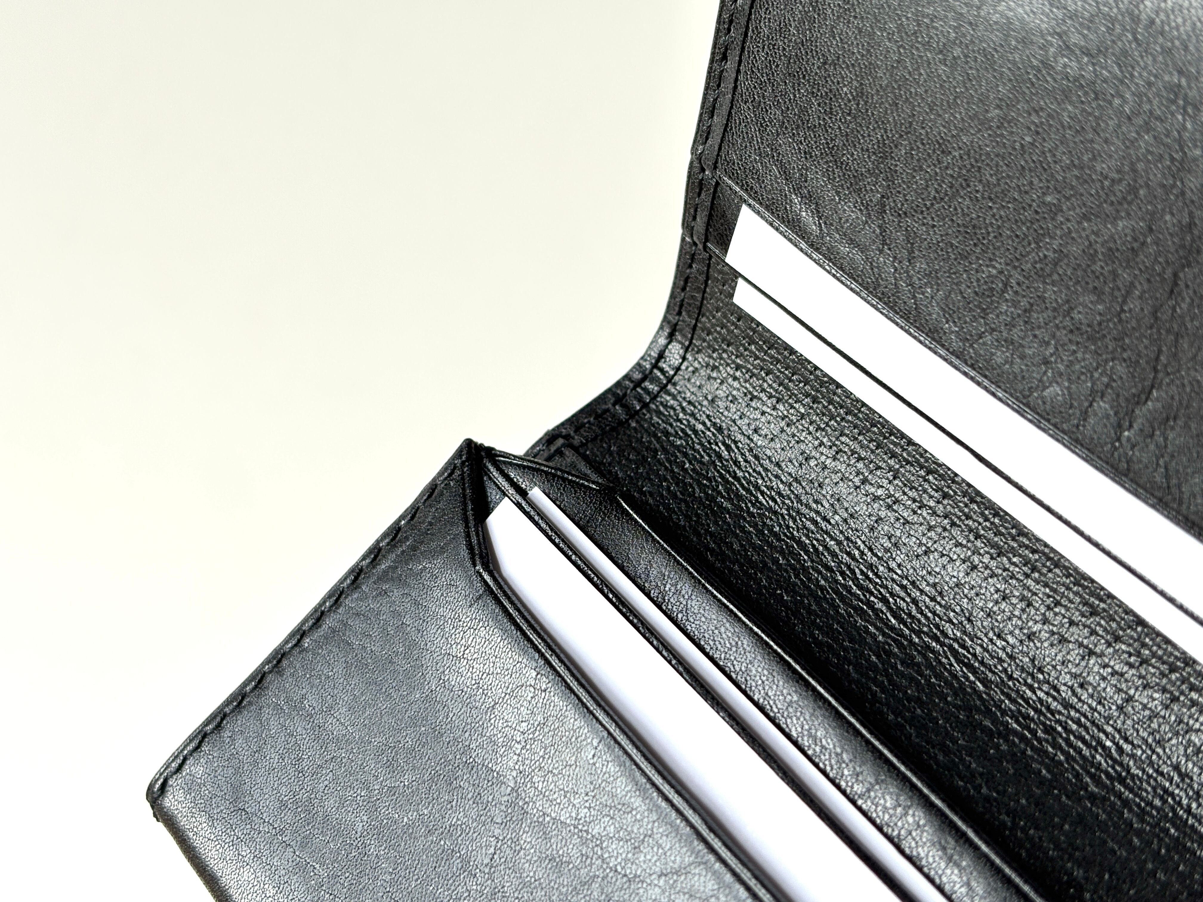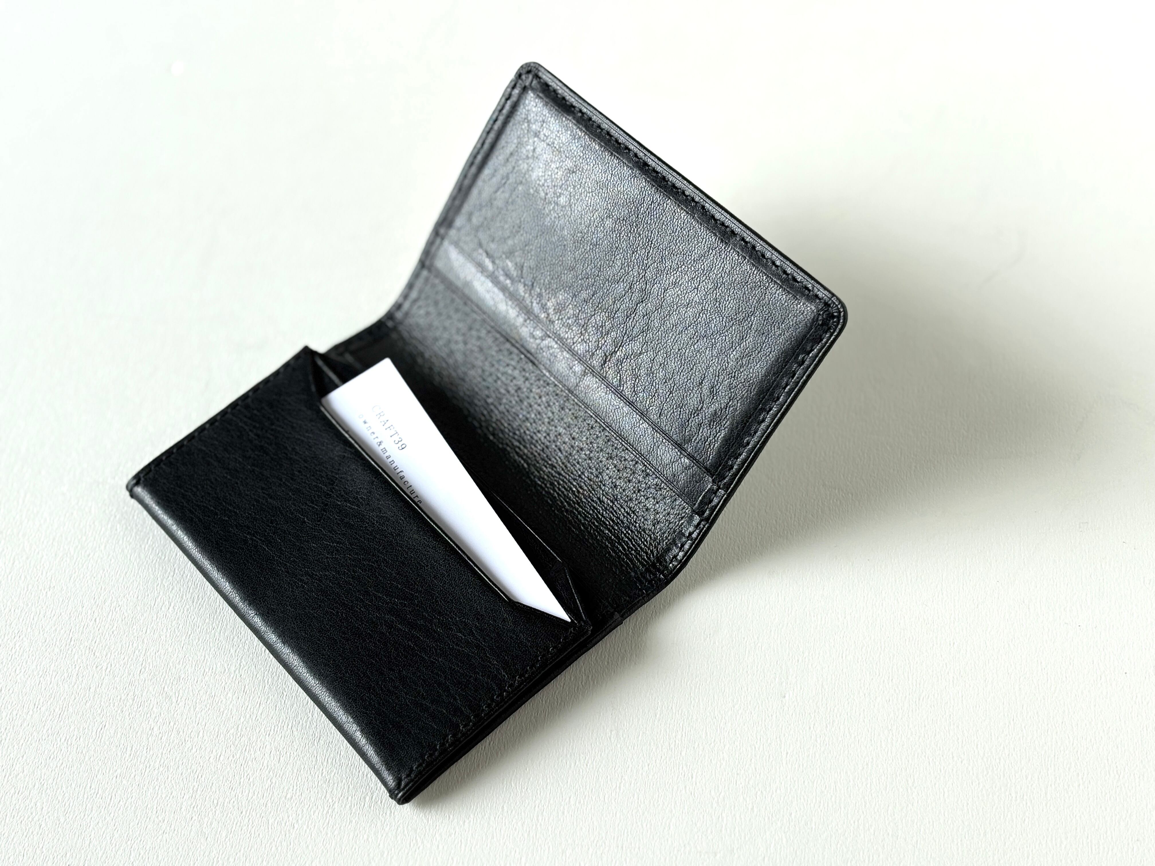 CRAFT39製品の名刺ケースはの「風琴マチ」という日本伝統技法を用いた特殊構造になっています。通常は内折りにマチを作るところ、外折りの"風琴マチ"構造にする事で、名刺を出し入れする際の引っ掛かりをなくし、最大20枚入れても厚さを抑える構造を実現しました。かぶせ側には、受け取った名刺を収納出来るポケットを二箇所搭載。閉じた際の背面にはフリーポケットを搭載させ、より収納力の高い構造にしました。内装には軽量化を目的とした、ほつれ留め加工が施されたコットン100%の天然素材を採用。加えて、内革にはアメ豚をあしらい、擦り傷や汚れが目立ちにくい構造にしました。ピンっと伸びる、折り紙のような美しい直線で構成されたデザインも注目ポイント。奥行きのある黒い光沢とさりげない内革のきめ細かいシボが、大人な魅力を引き出してくれます。名刺入れの正面と背面で異なる豊かな革の表情をお楽しみ頂きながら、巧みな職人技を感じて頂けると幸いです。