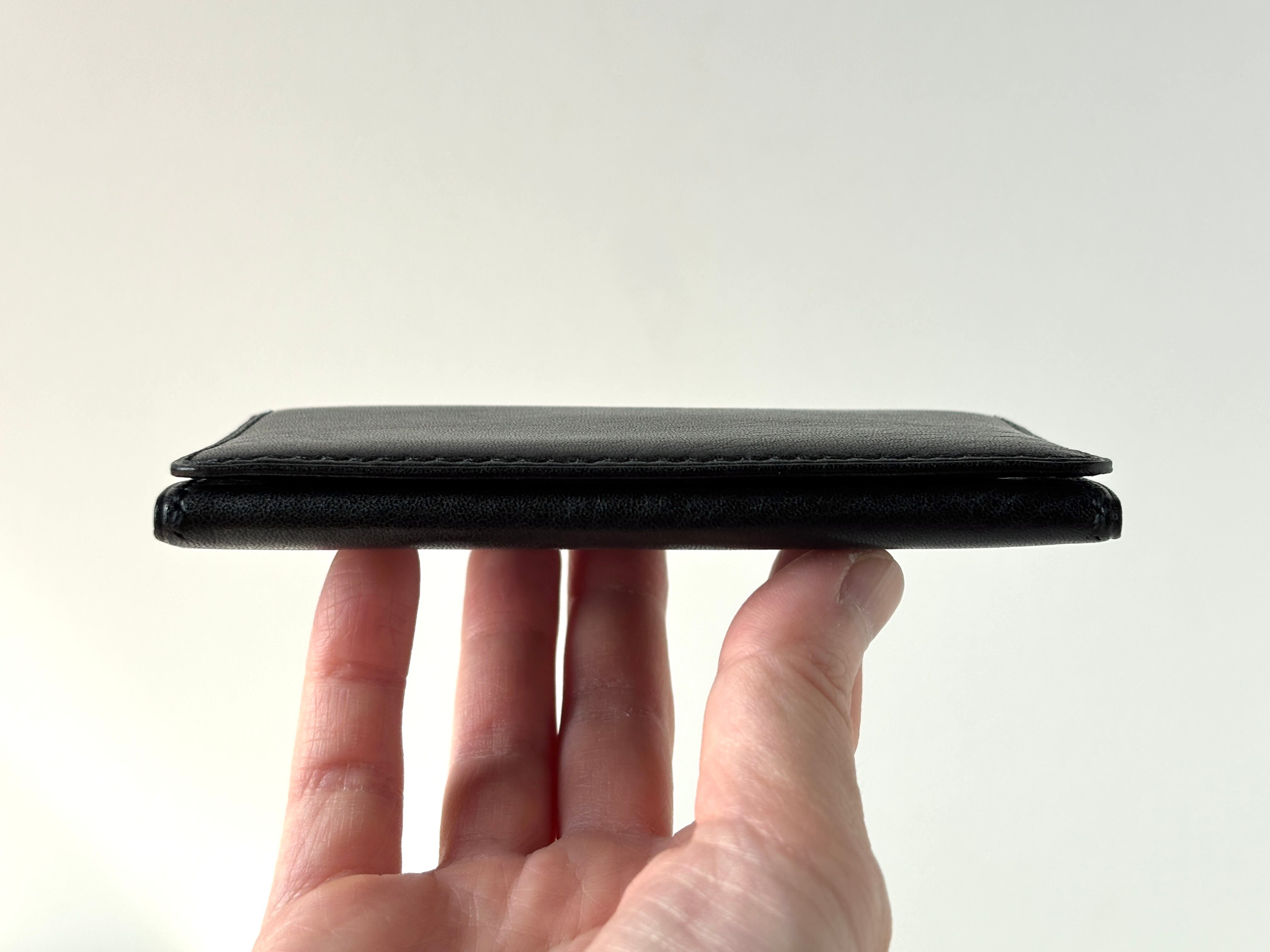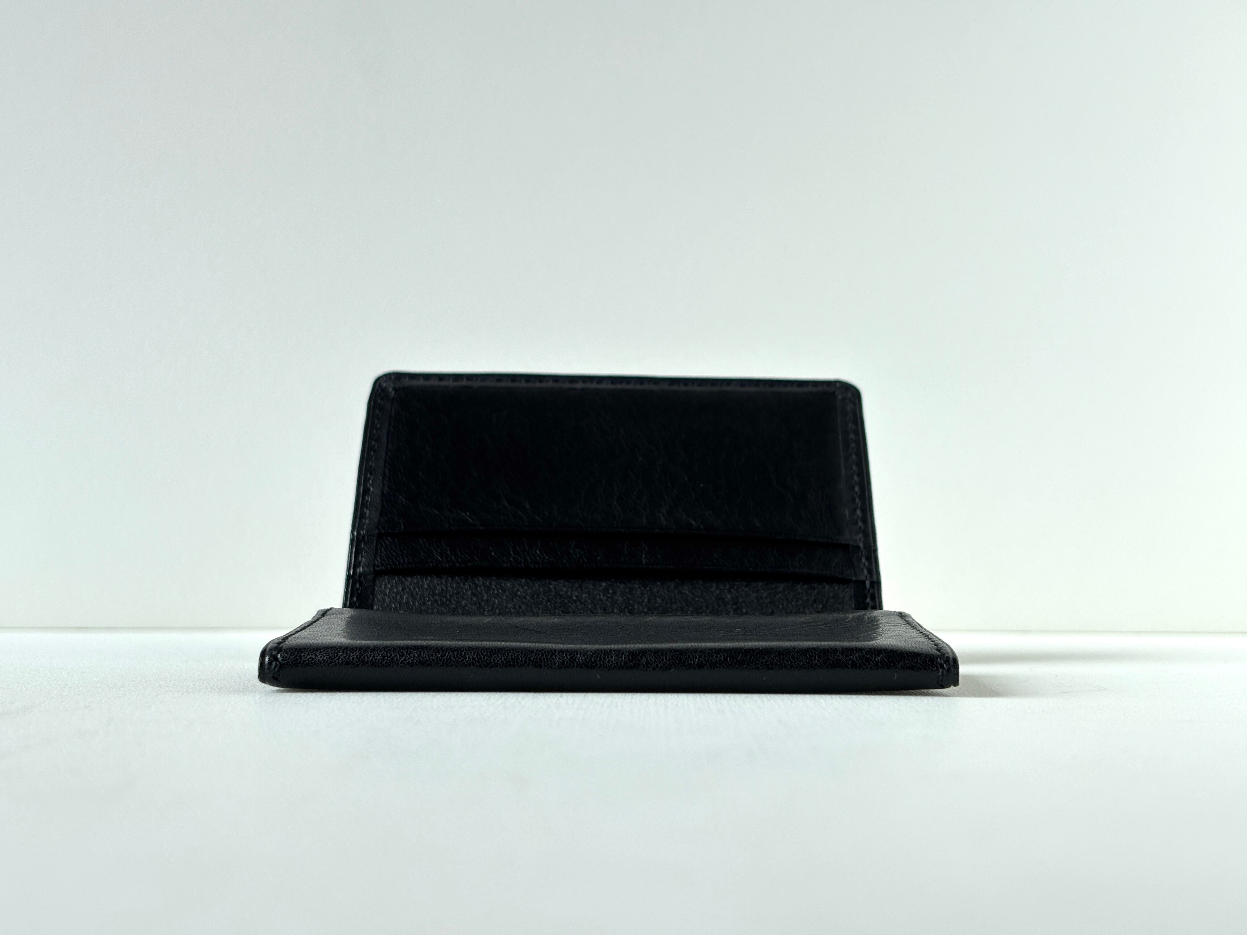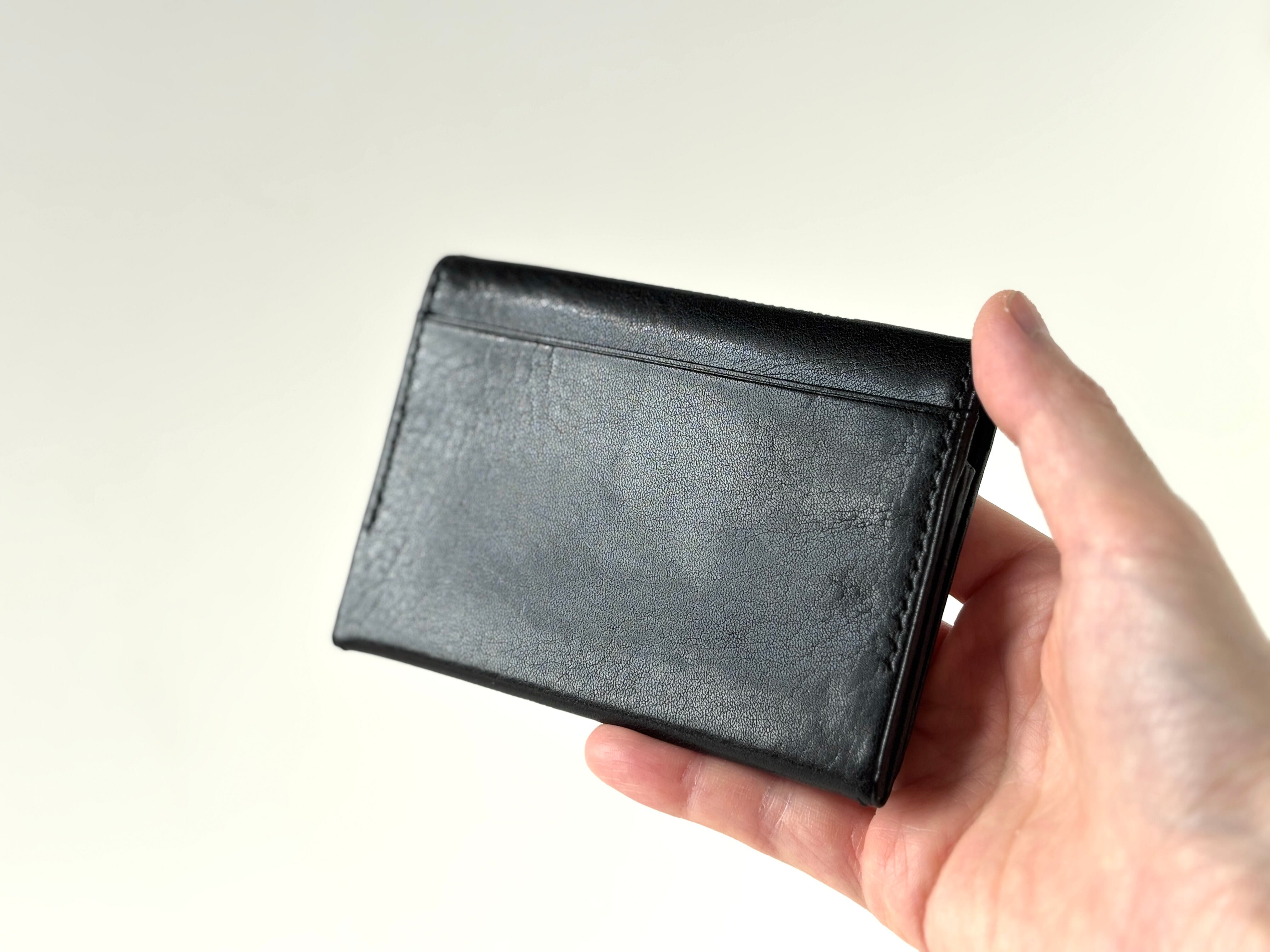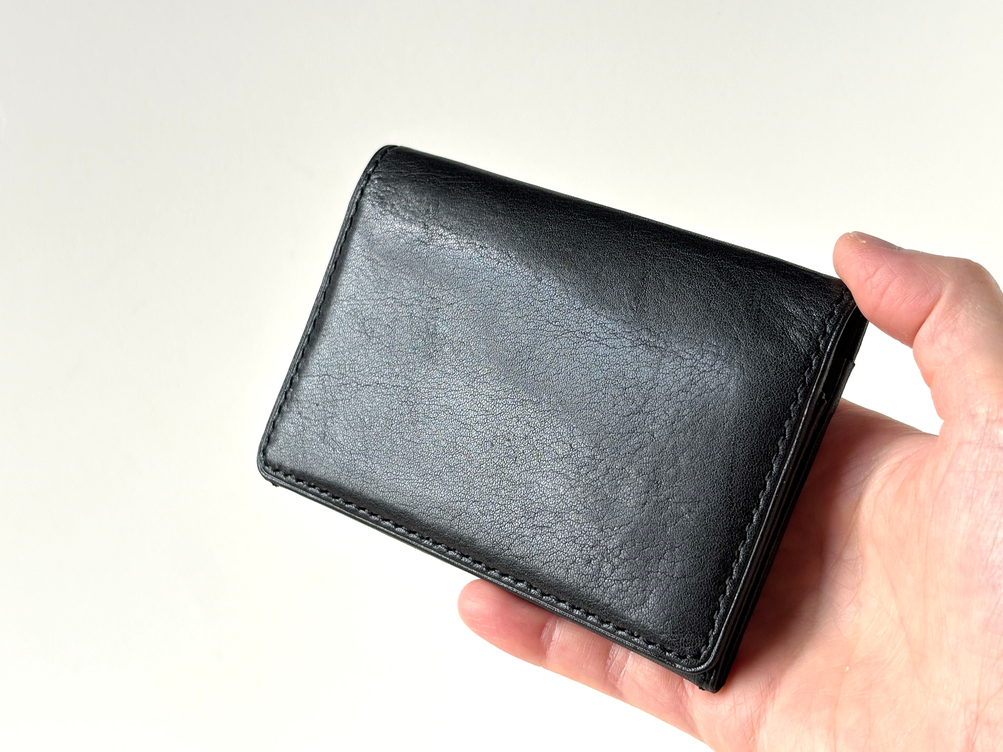 CRAFT39製品の名刺ケースはの「風琴マチ」という日本伝統技法を用いた特殊構造になっています。通常は内折りにマチを作るところ、外折りの"風琴マチ"構造にする事で、名刺を出し入れする際の引っ掛かりをなくし、最大20枚入れても厚さを抑える構造を実現しました。かぶせ側には、受け取った名刺を収納出来るポケットを二箇所搭載。閉じた際の背面にはフリーポケットを搭載させ、より収納力の高い構造にしました。内装には軽量化を目的とした、ほつれ留め加工が施されたコットン100%の天然素材を採用。加えて、内革にはアメ豚をあしらい、擦り傷や汚れが目立ちにくい構造にしました。ピンっと伸びる、折り紙のような美しい直線で構成されたデザインも注目ポイント。奥行きのある黒い光沢とさりげない内革のきめ細かいシボが、大人な魅力を引き出してくれます。名刺入れの正面と背面で異なる豊かな革の表情をお楽しみ頂きながら、巧みな職人技を感じて頂けると幸いです。