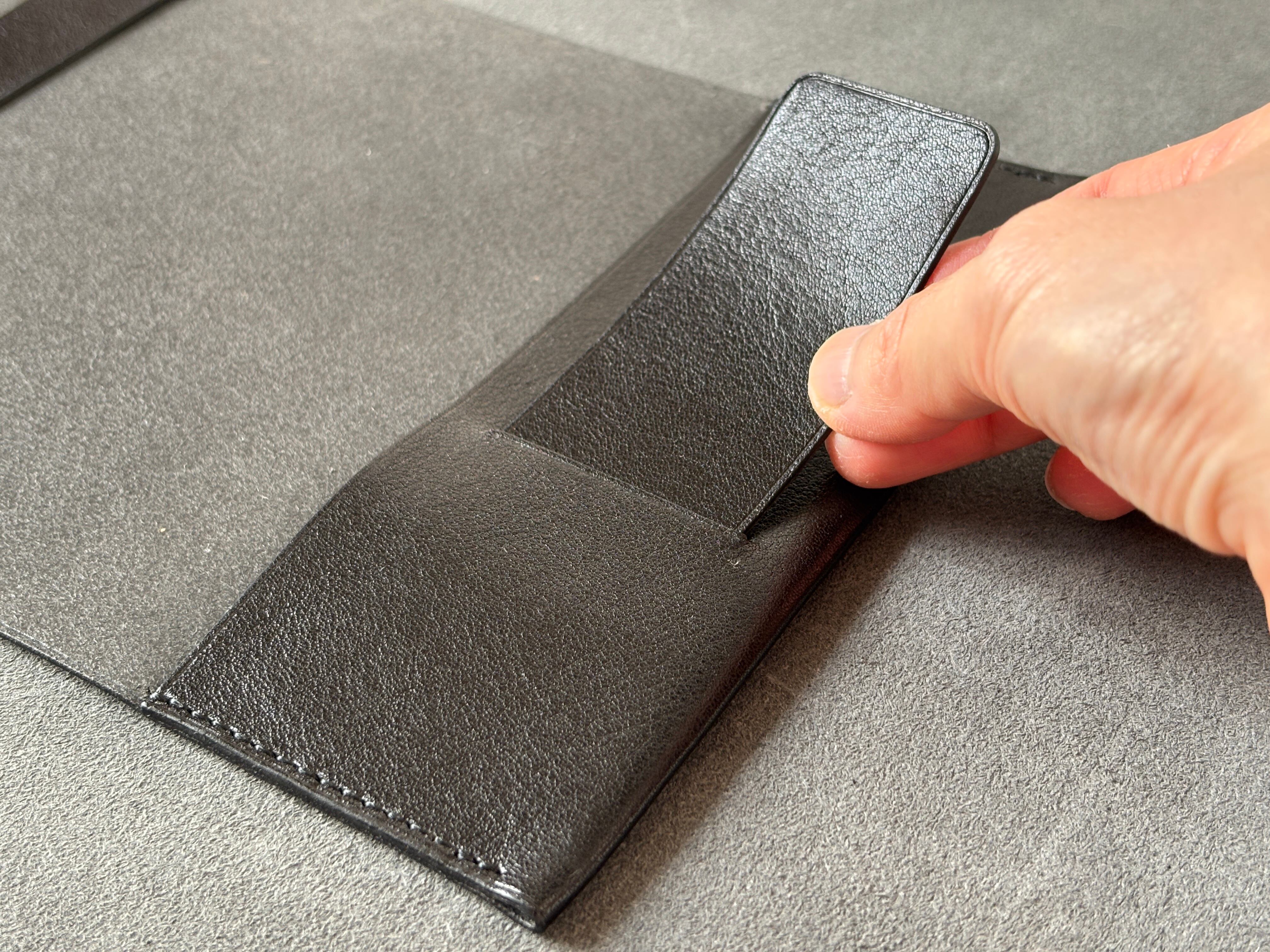 ・セットで管理:使用しないときにカバーと栞をセットで保管できるよう、収納ポケットを設置しました