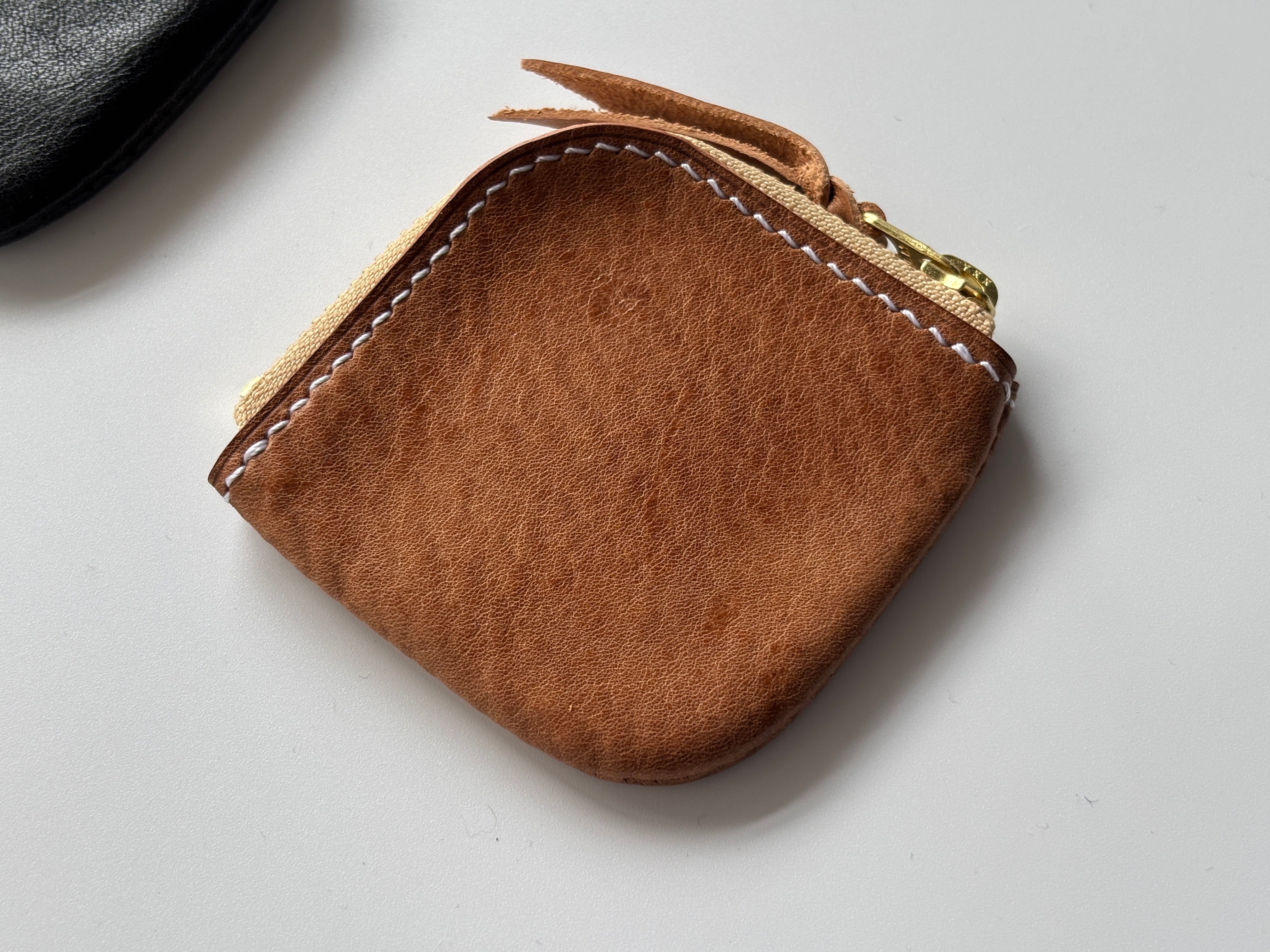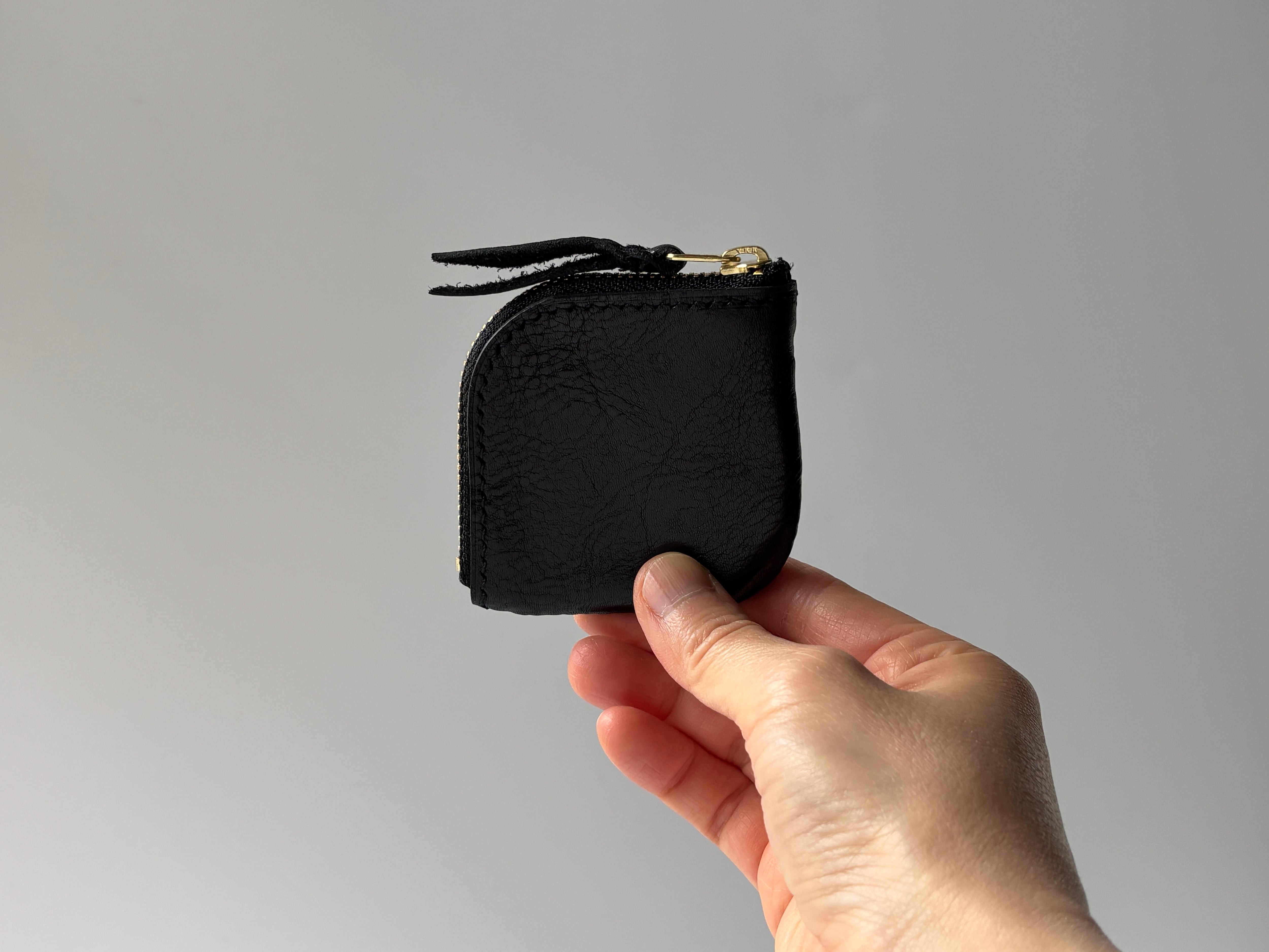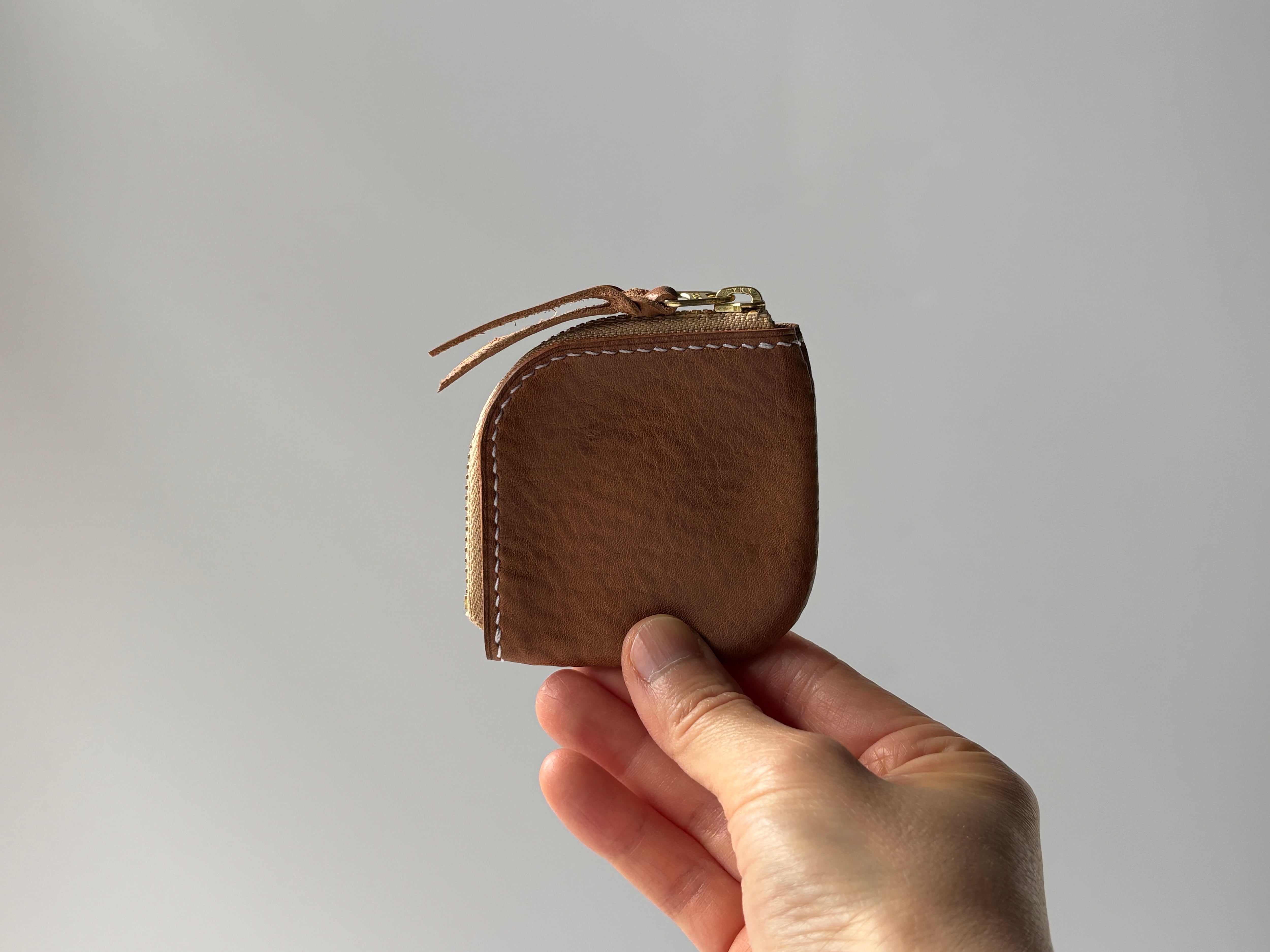 L字ファスナーを採用することで、開閉時に革が柔らかくたわみ、口元が大きく開く構造になっています。中身を隅々まで見渡せ、20枚もの小銭を余裕で収納できる「絶妙なサイズ」にこだわりました。引き手には、指に馴染むワンポイントの革持ち手を取り付け、コンパクトながらもしっかりと力を入れて開け閉めできる実用性を備えています。