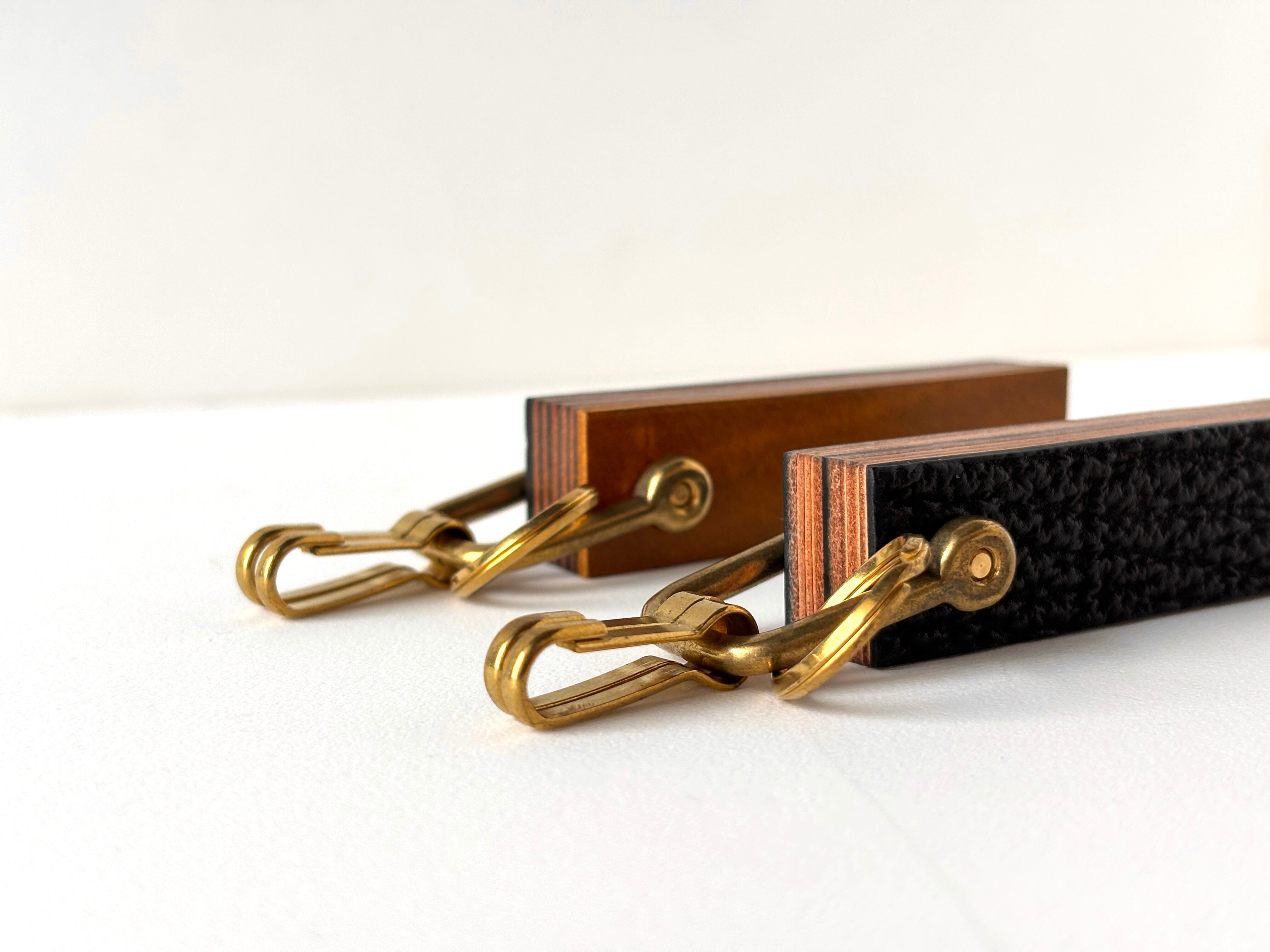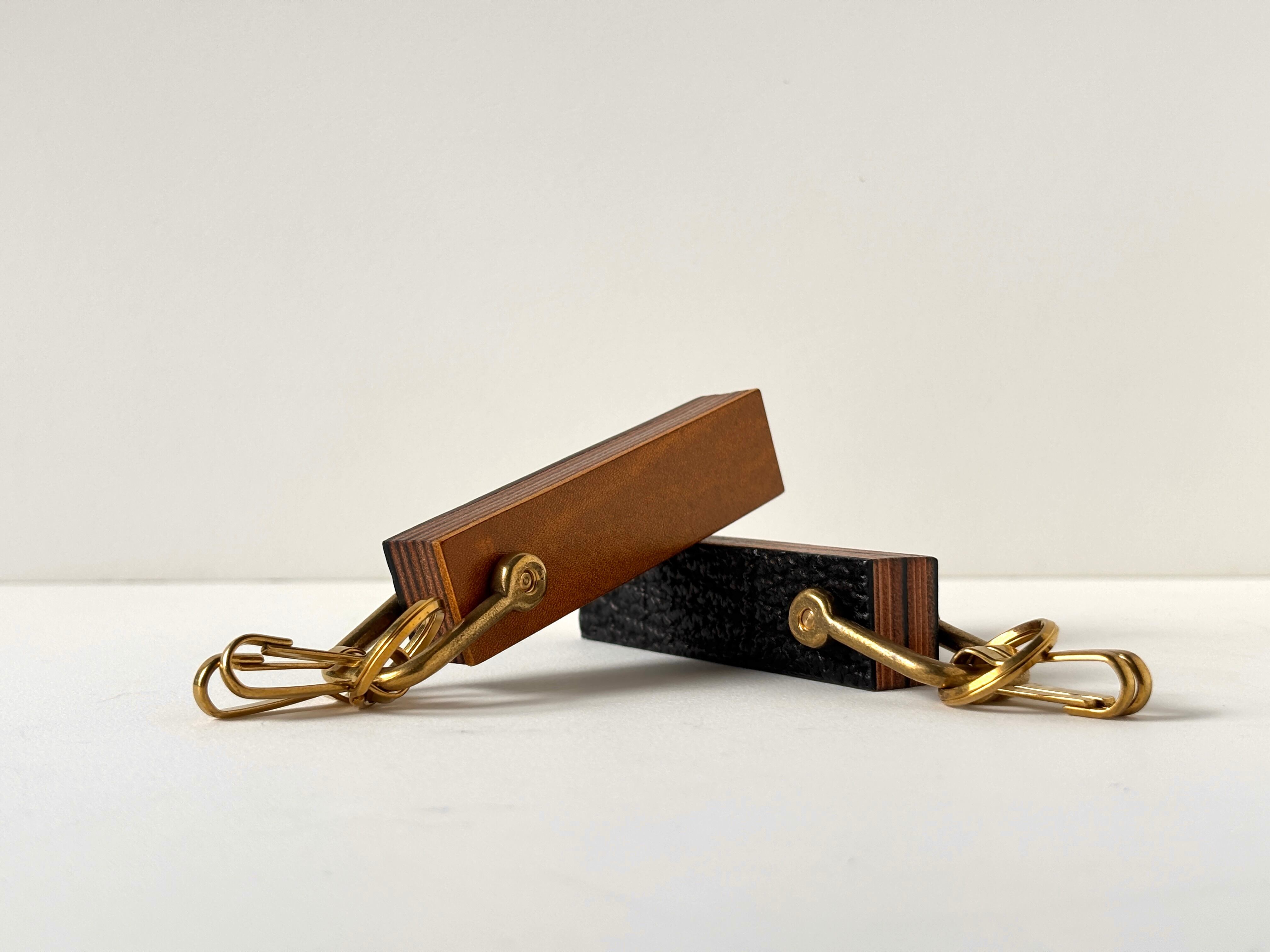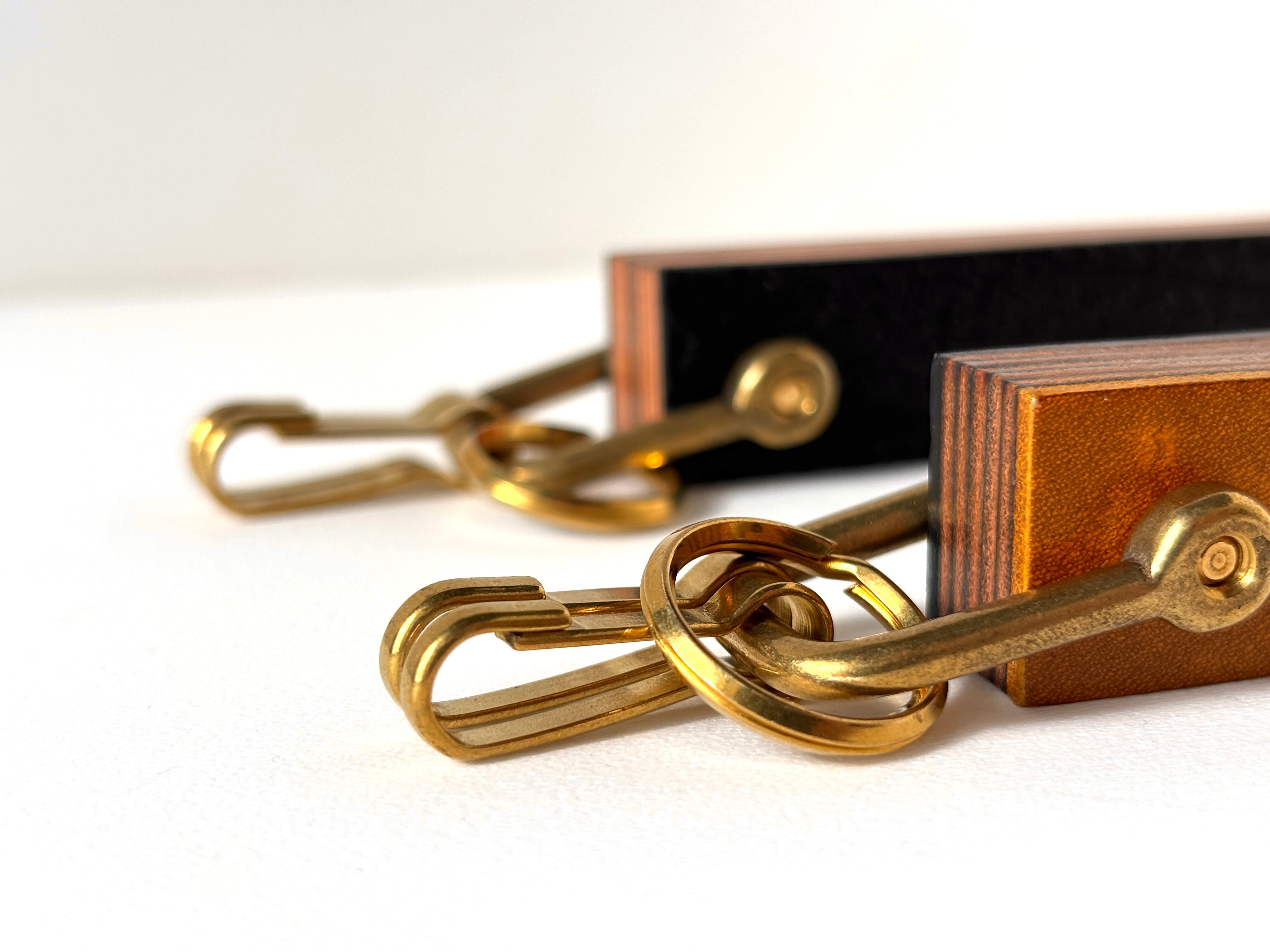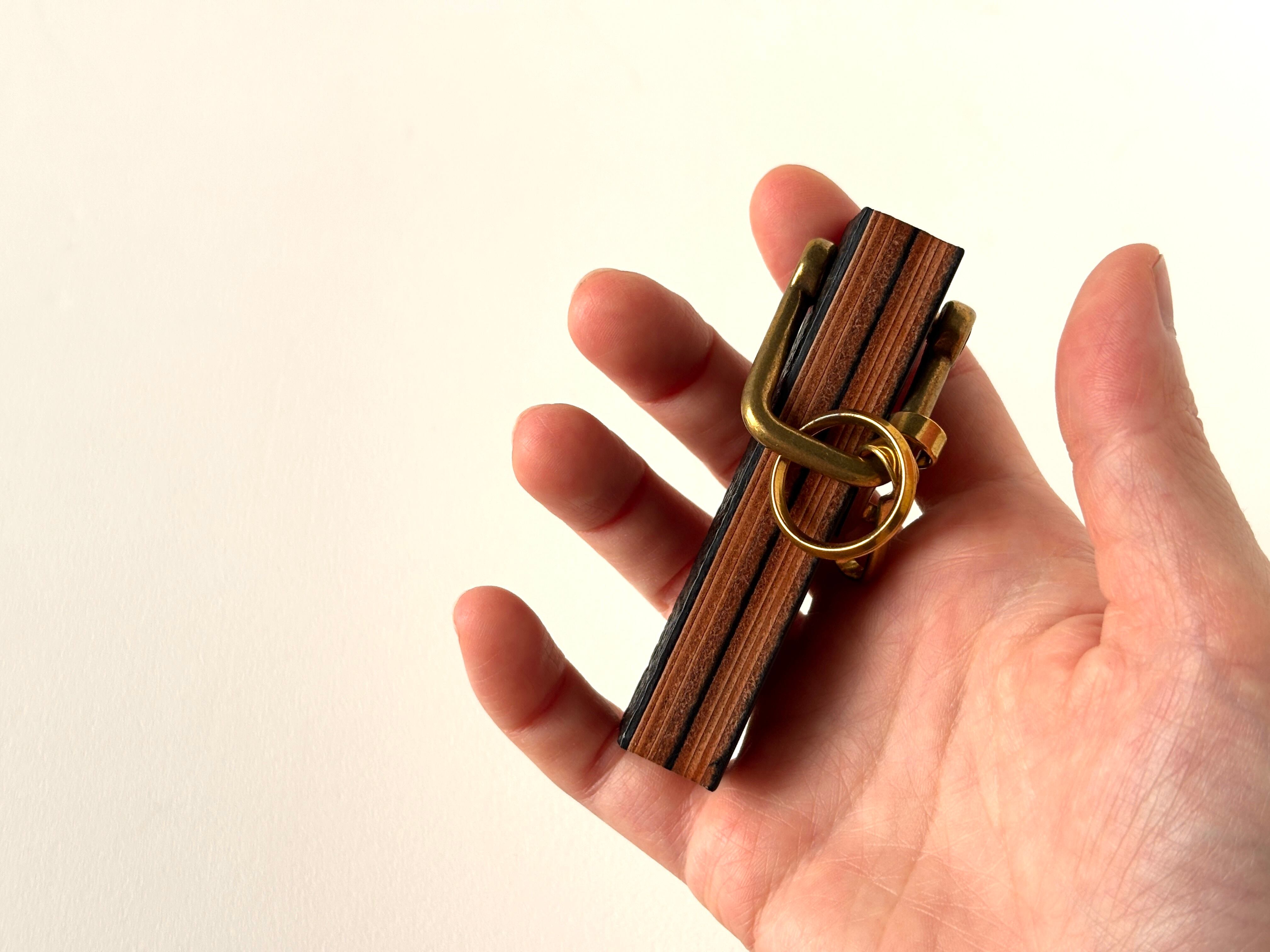 ミルフィーユの断面を忠実に再現する為、何種類もの革をパイ生地の様に重ね合わせた贅沢な構造になっています。積層した一番外側 ( 片面 )には、珍しいサメ ( 黒 ) の革や革の宝石と呼ばれるルガトー ( マスタード )と呼ばれる革をあしらった高級仕様になっています。一枚一枚丁寧に圧着していき、ケーキをカッティングする時のように真っ直ぐに裁ち落とすことで、美しい断面を実現しました。耐久力を上げる為、断面もしっかりと磨き上げています。使用頻度の高い鍵をスムーズに取り出せるようにコナスを二つ付け、その他の鍵やお好みのチャームを追加でカスタム出来る二重丸カンを採用。機能的な面に加え、遊び心のある太めの真鍮シャックルを付けました。革とは疑ってしまう佇まいは職人が一つ一つ貼り合わせているもので、同じ断面は一つとしてなく、唯一無二の一点ものです。