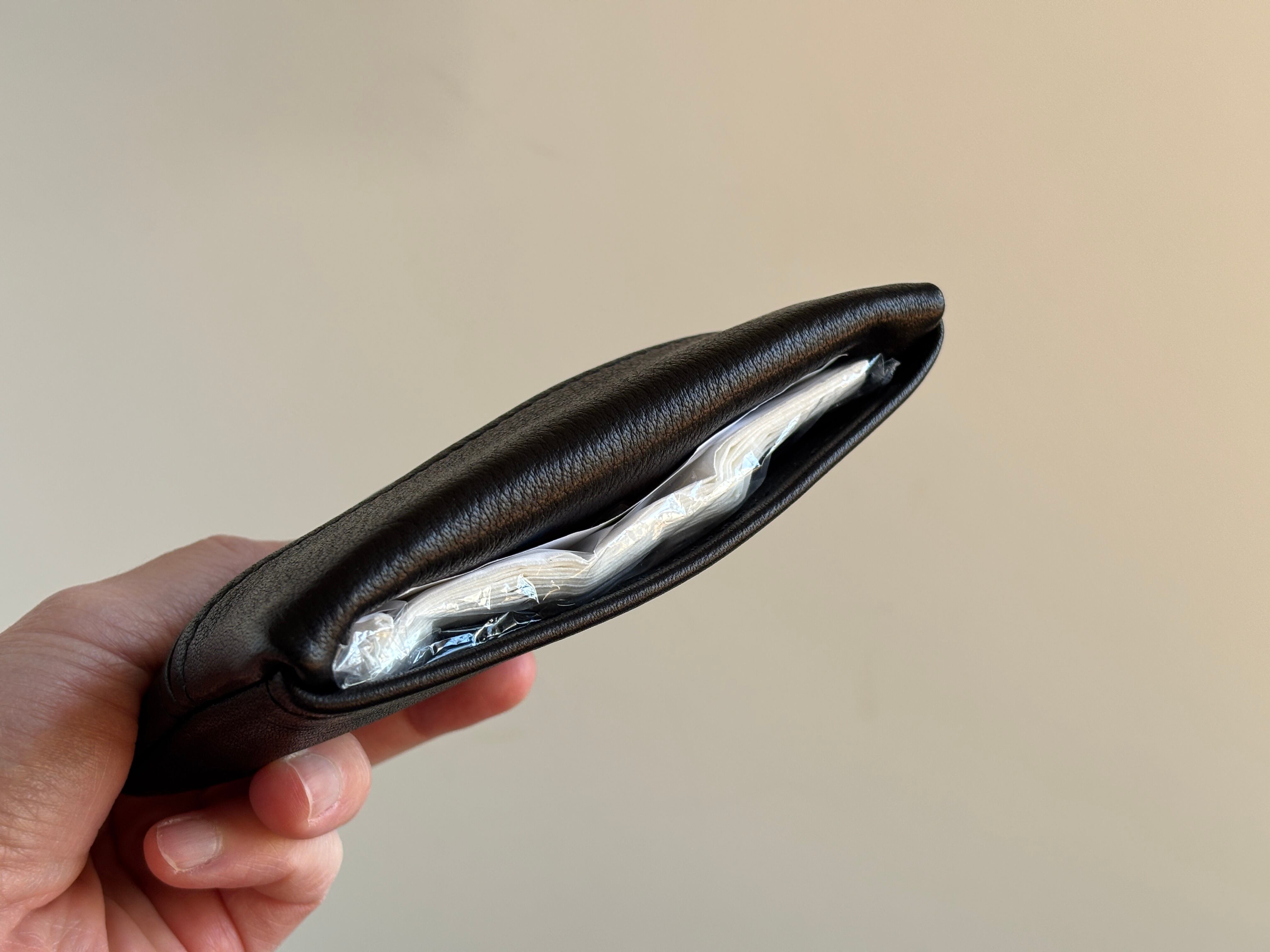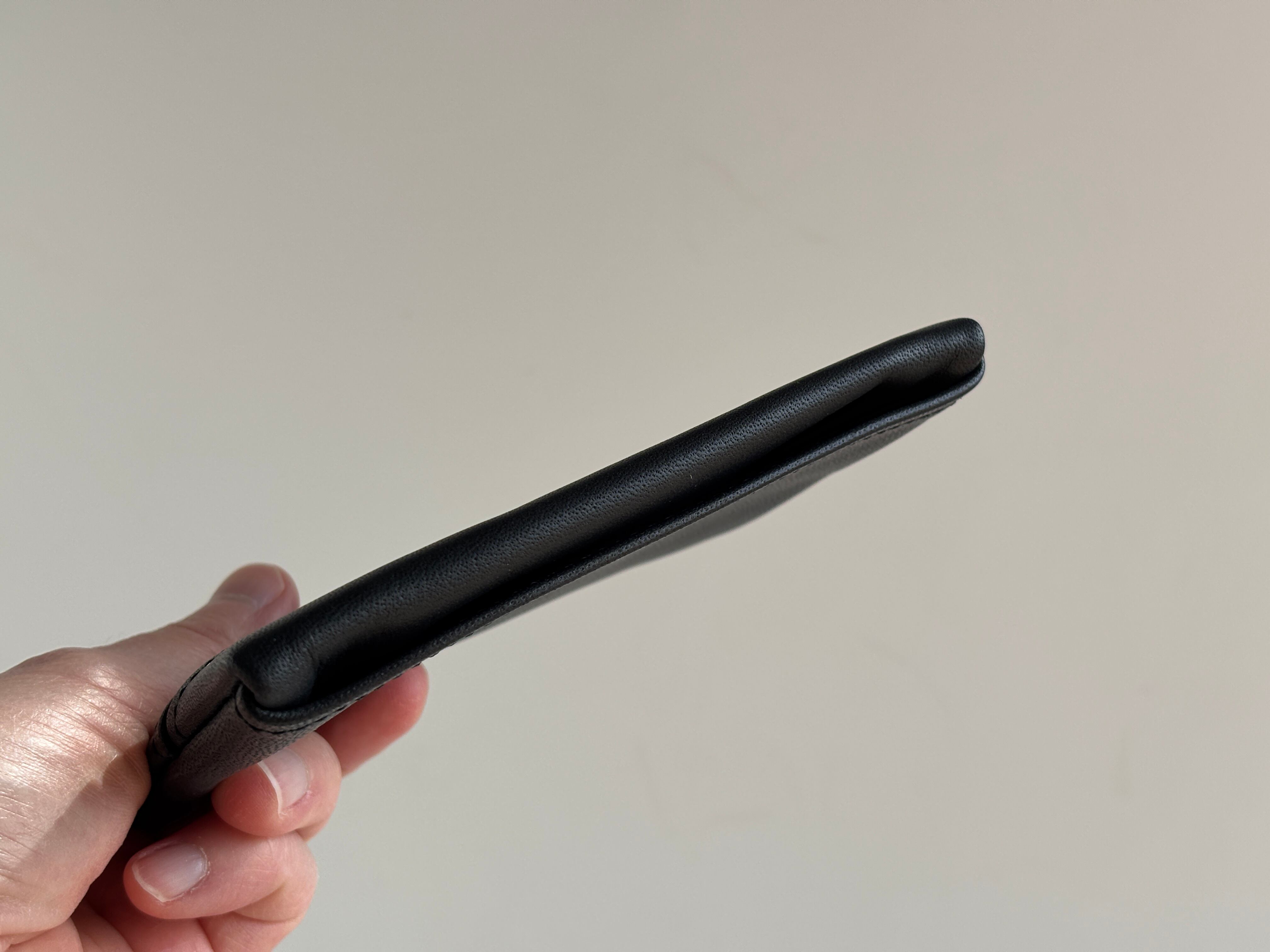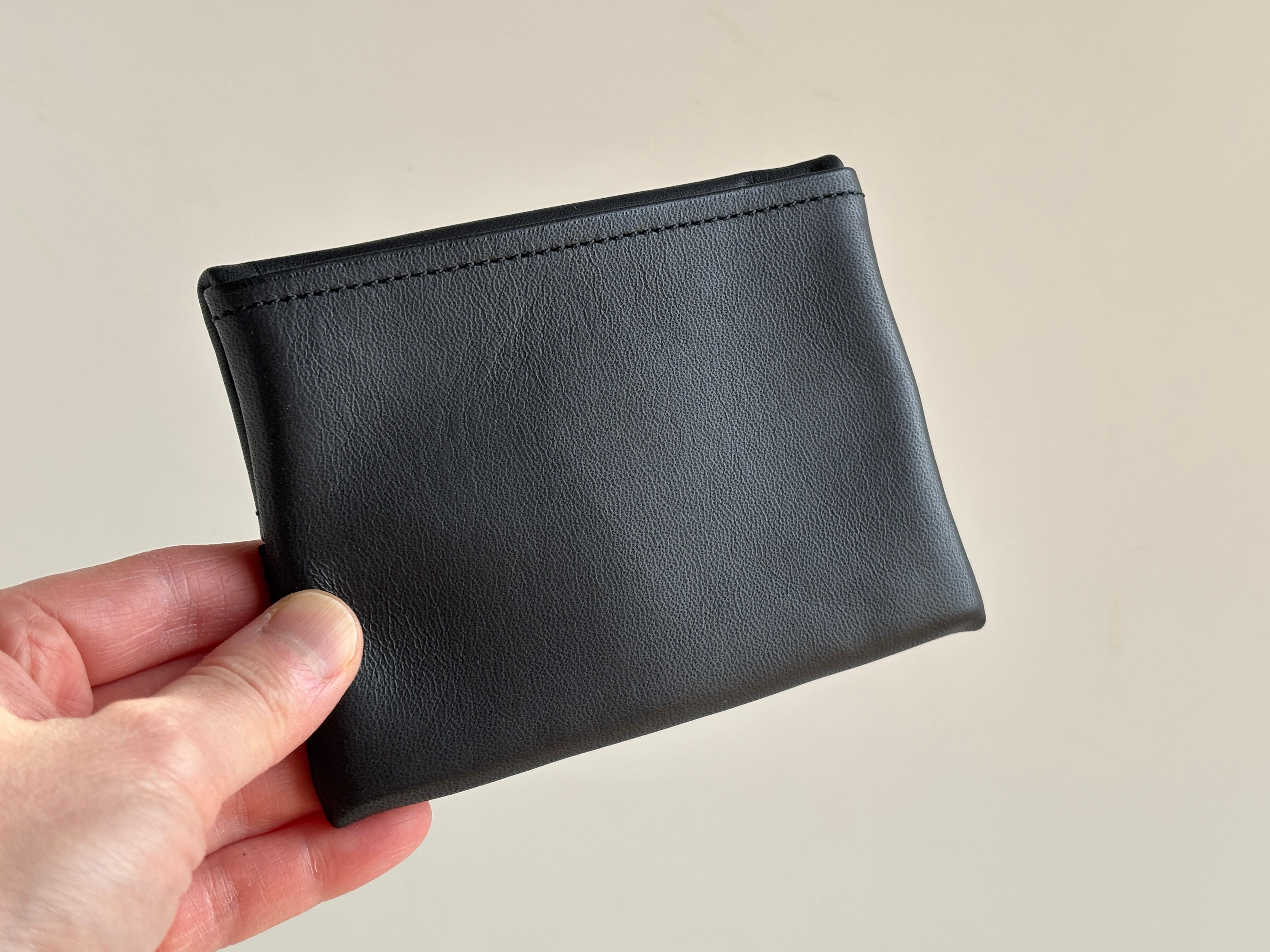 携帯時の厚みを抑え、コバ ( 素材の切り口 ) の毛羽立ちを防ぎます。