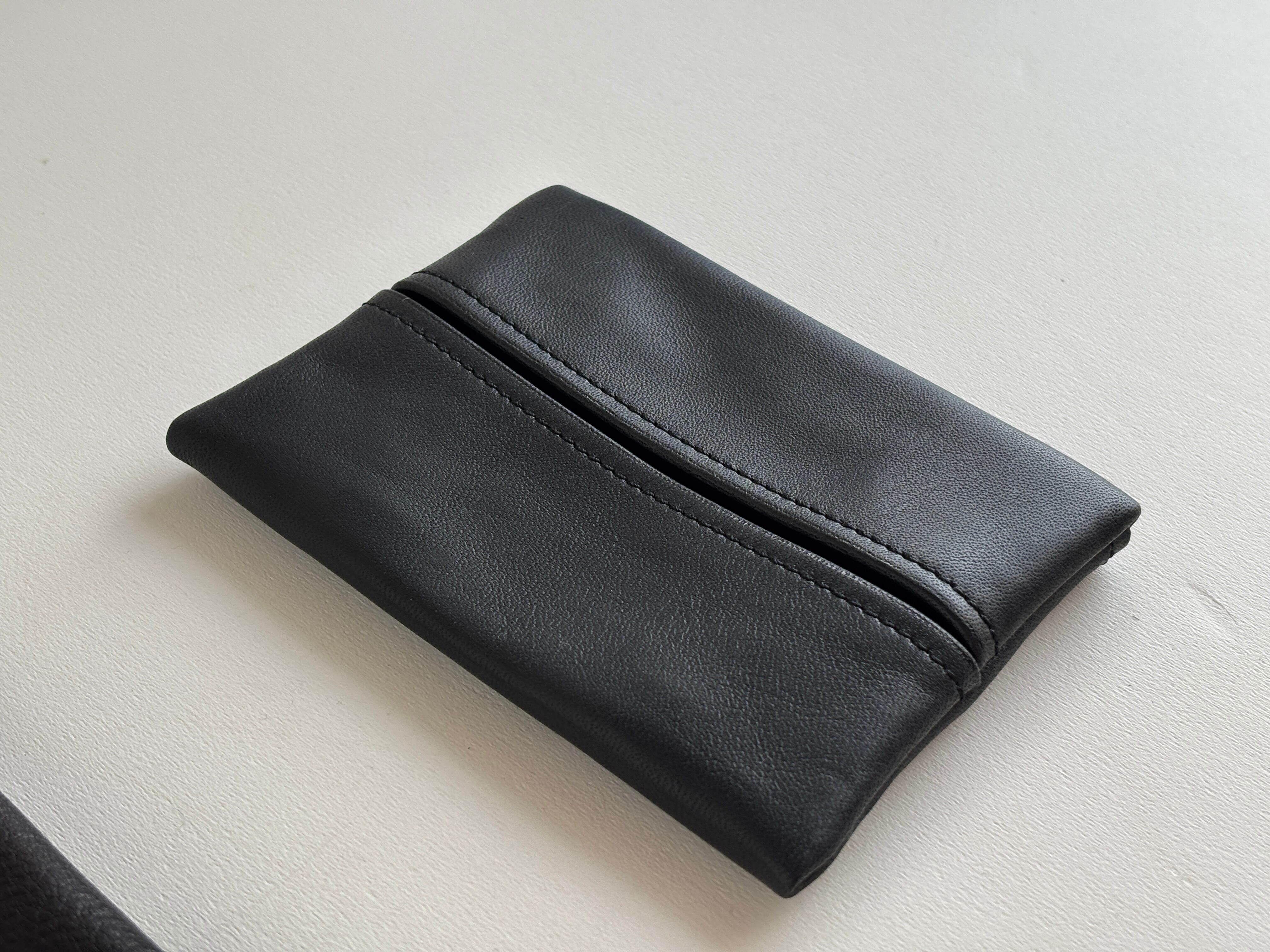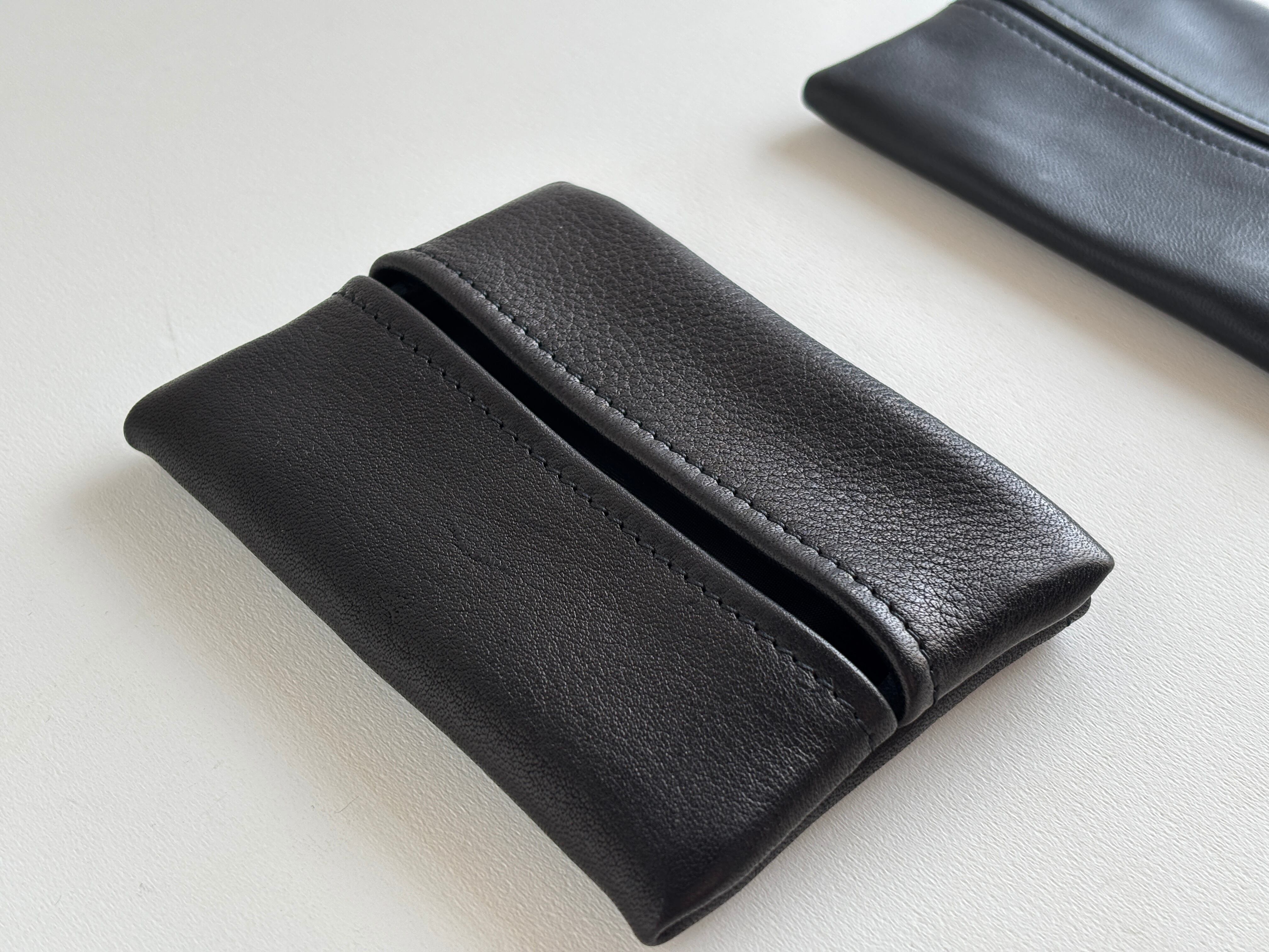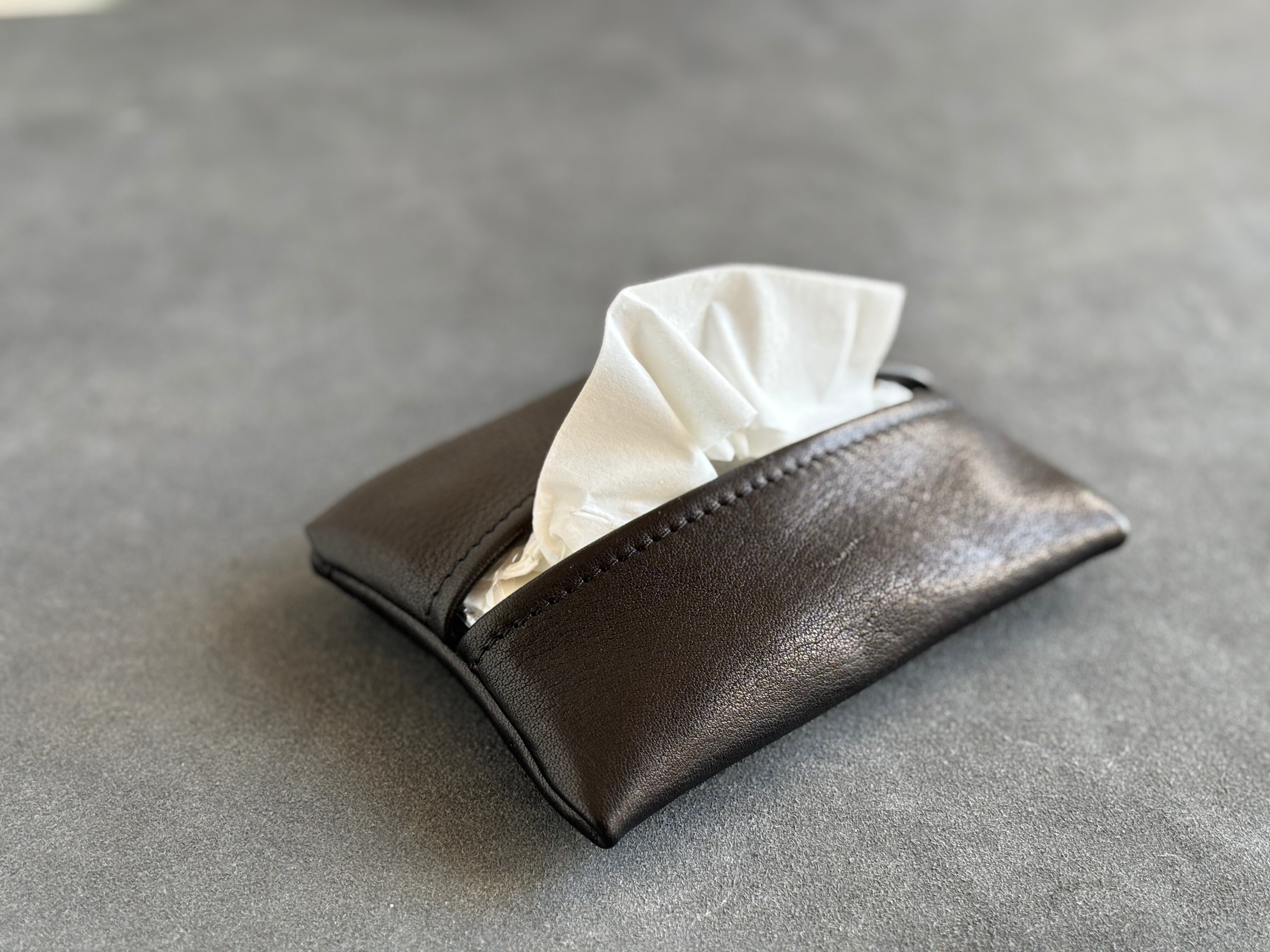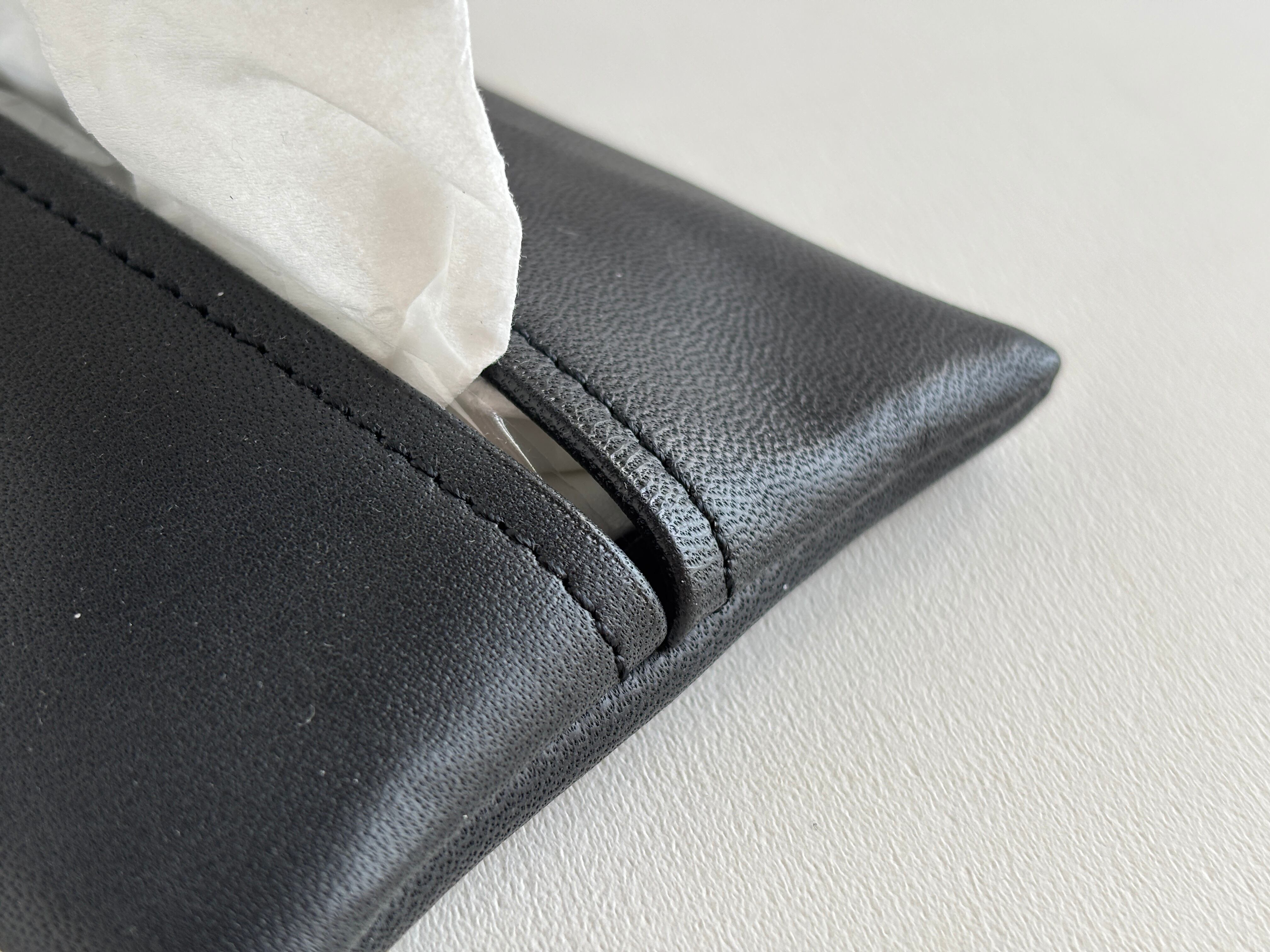 ティッシュの取り出し口は、革を折り返す「ヘリ返し」という技法を施し、耐久性を高めた構造になっています。