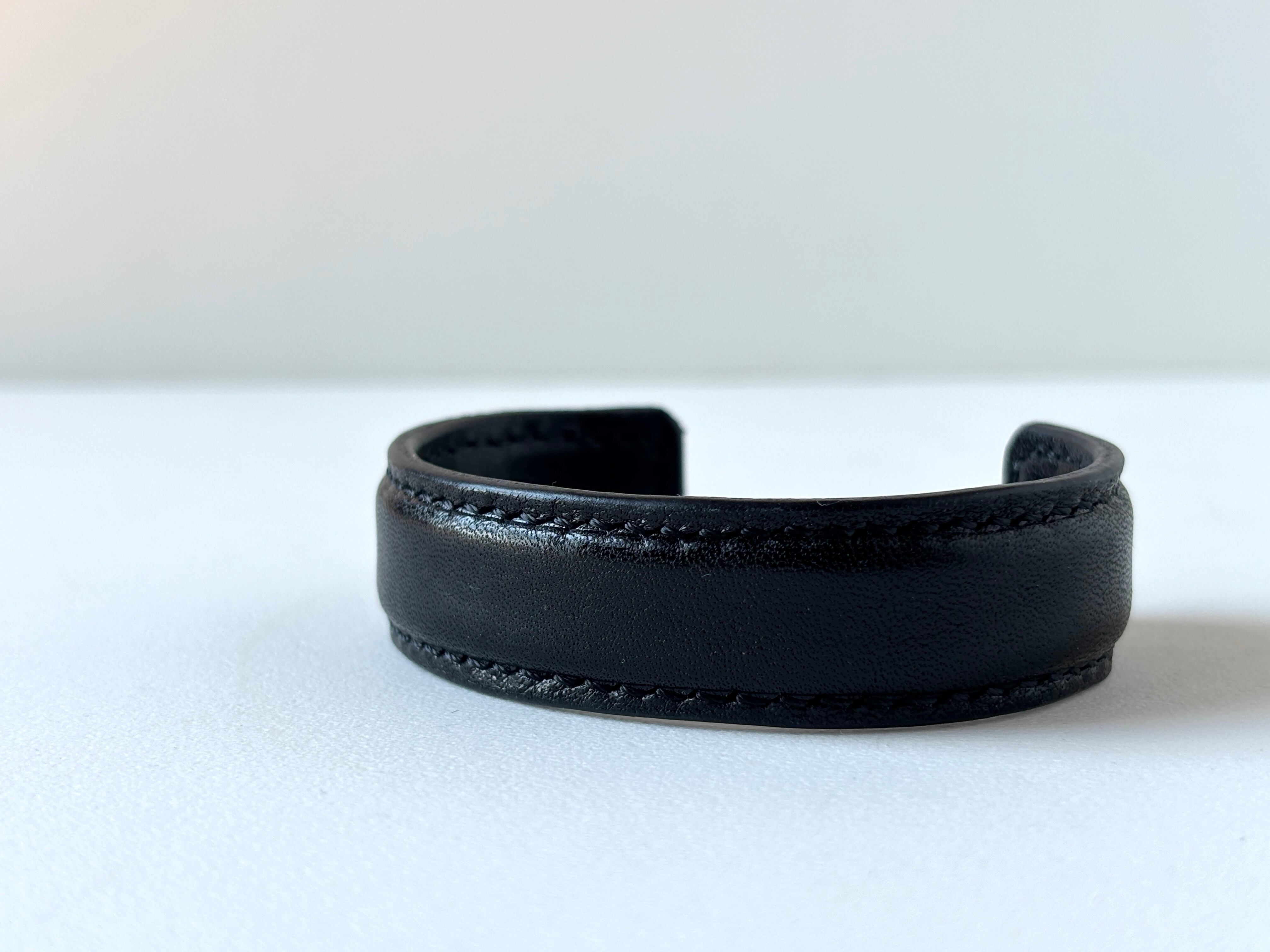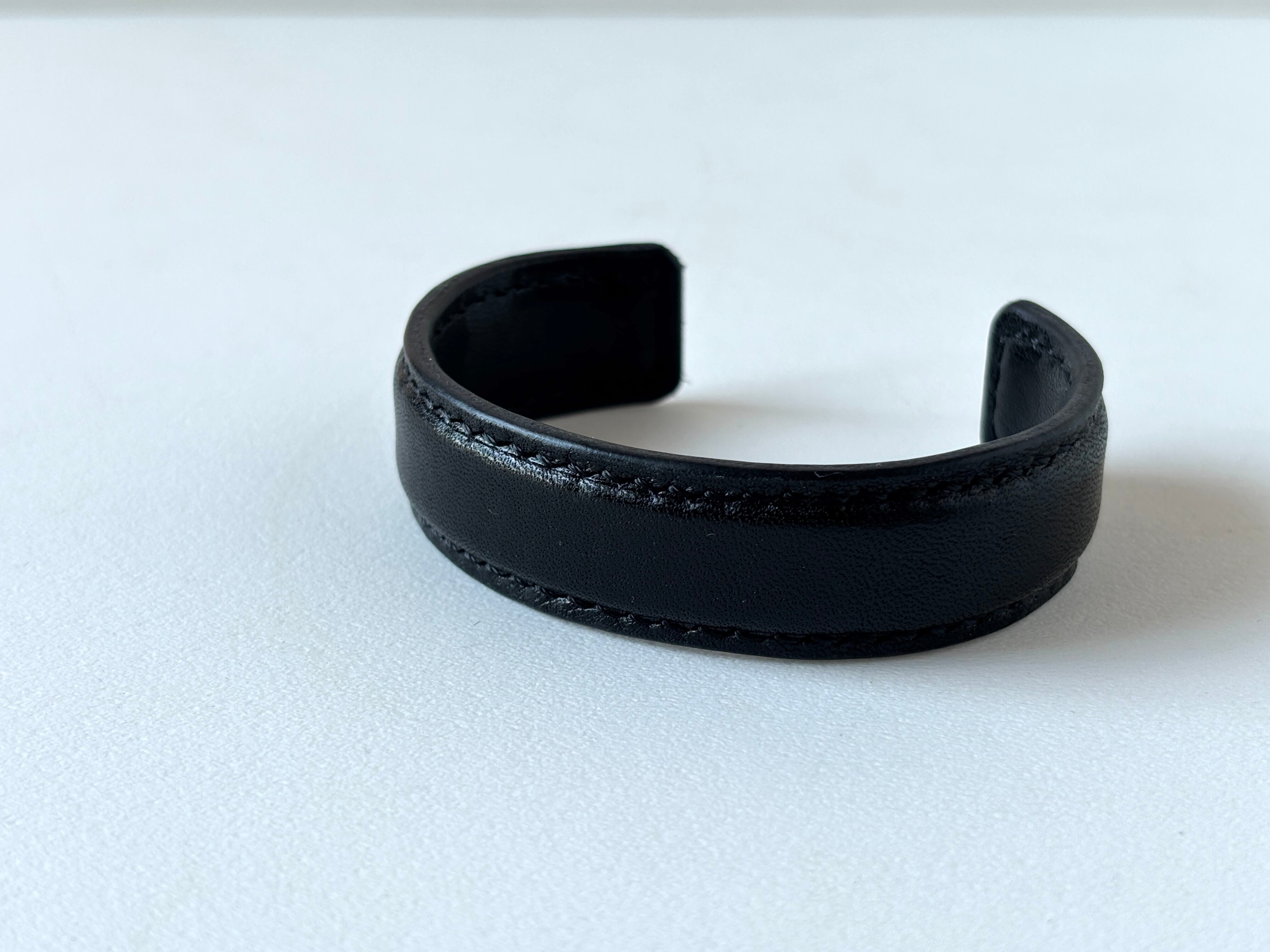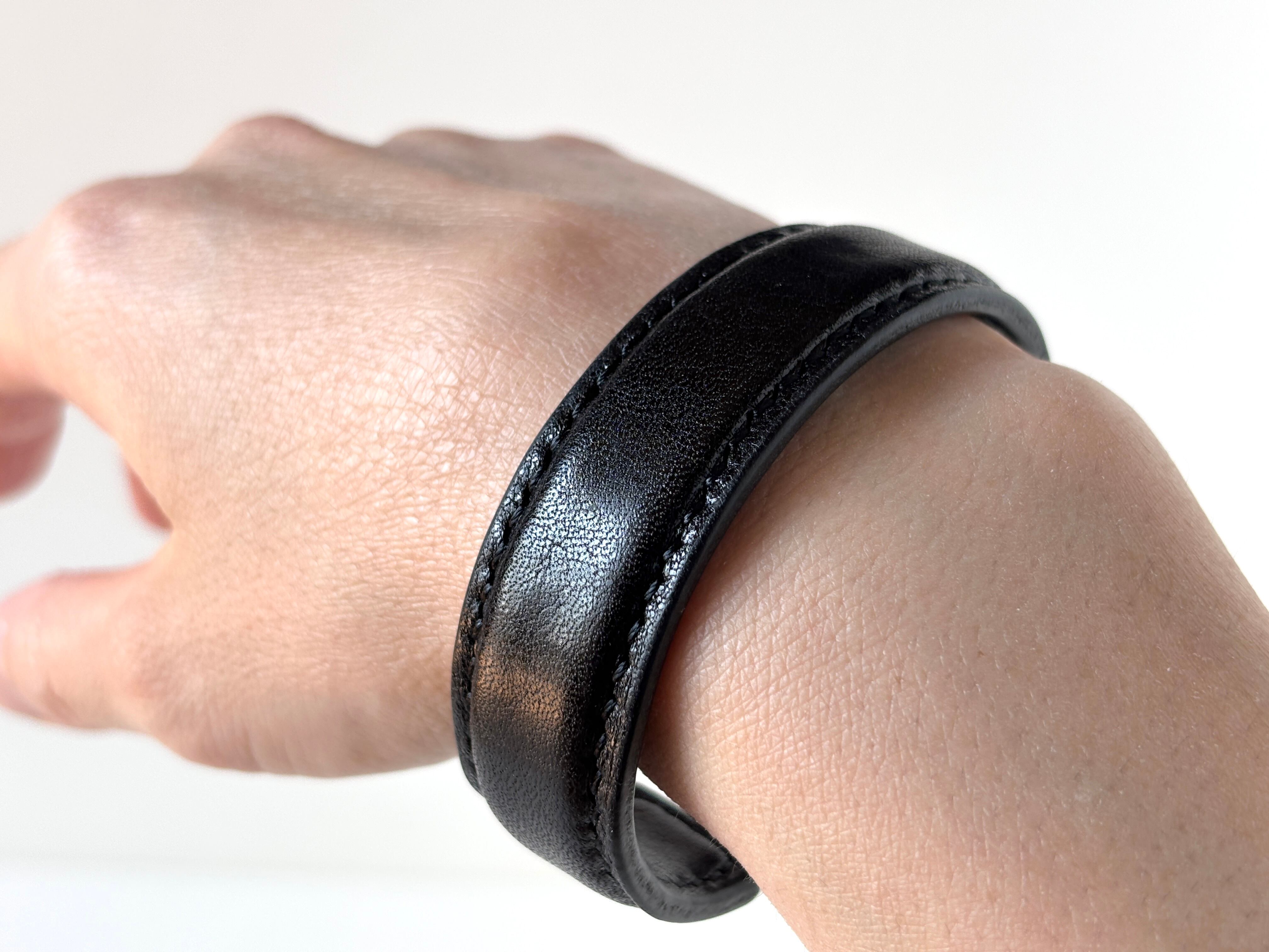 金属を挟み込むように縫い上げた存在感のあるバングルです。