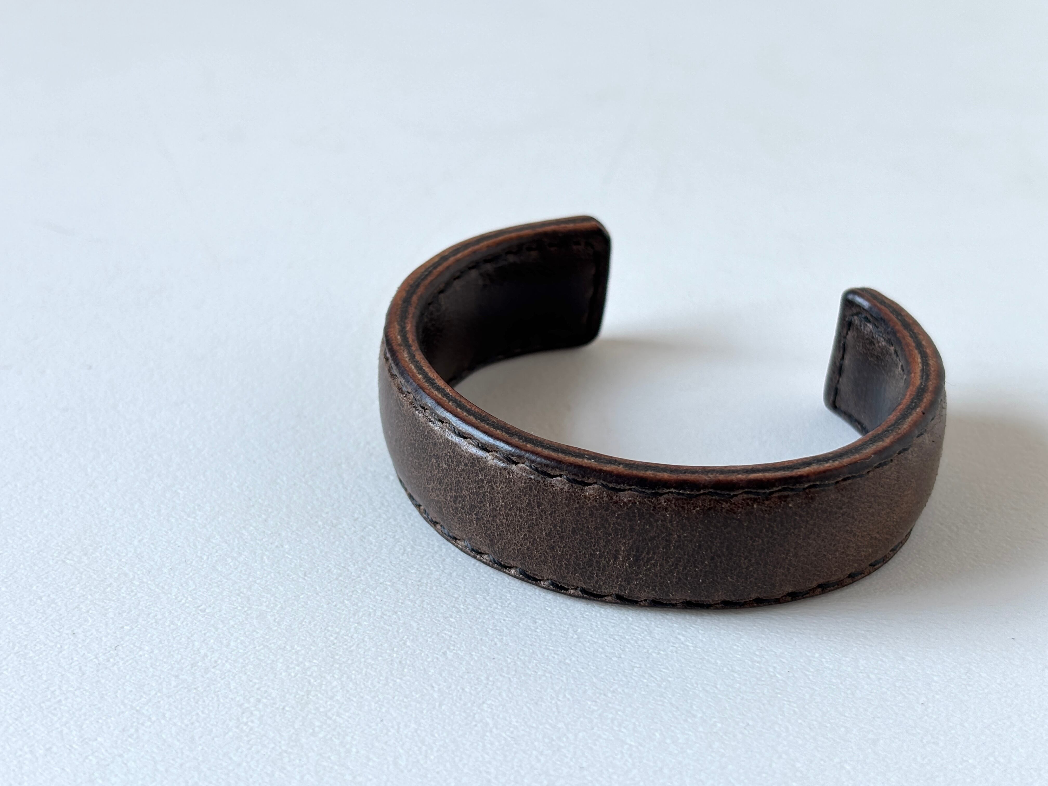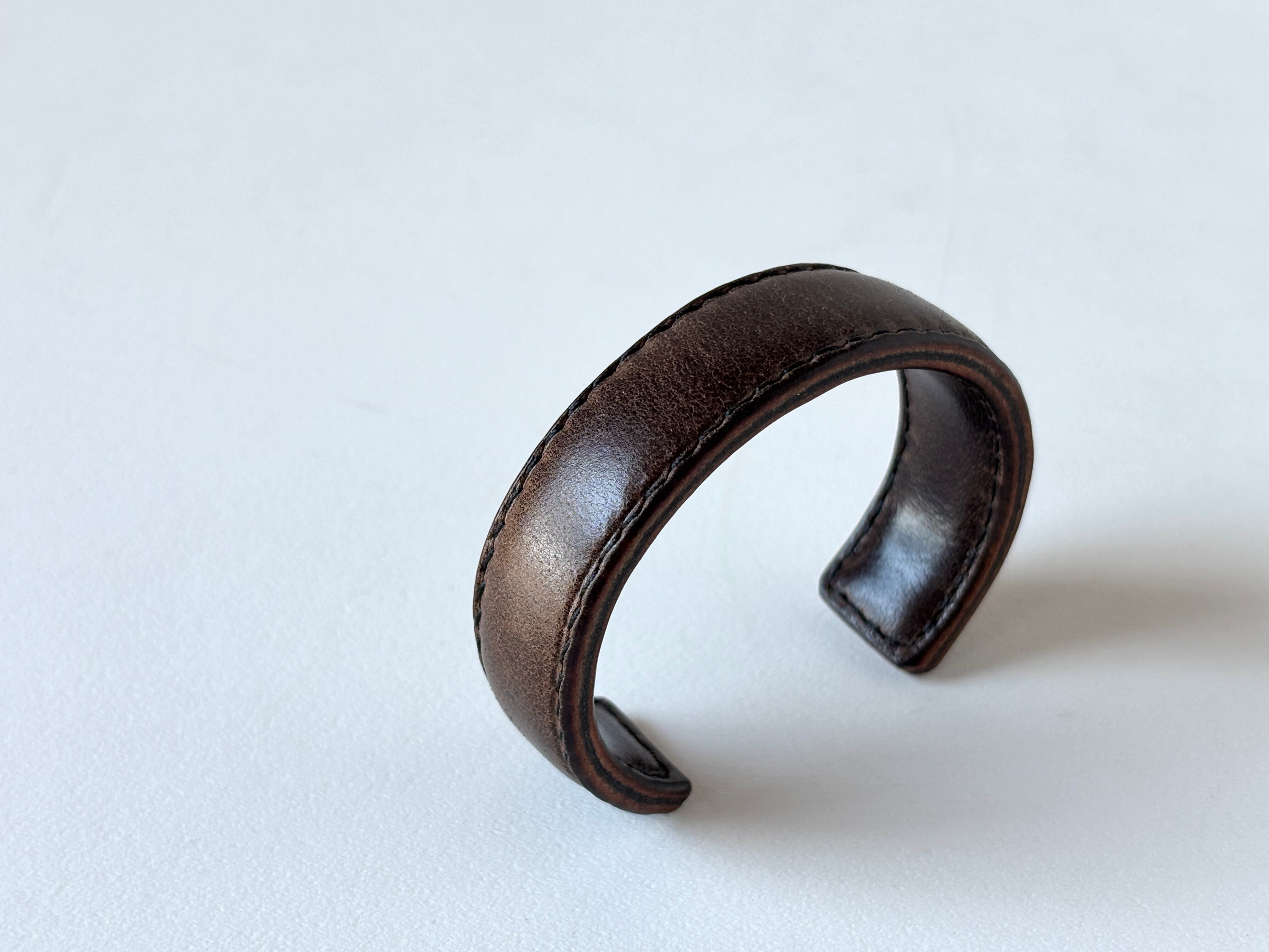 CRAFT39のバングルは、内部の金属を挟み込むように縫い上げた、やや重厚感のある佇まいが特徴です。金属に沿ってくっきり出たキャラクターラインが、光沢に動きを持たせ、単体でつけても非常に存在感があります。少し力を加えることで、内部の金属をご自身の手首に合わせて調節出来ます。革で包まれていますので、時計やアクセサリーなど、一緒につけるアイテムを傷つける心配がありません。ガシガシ使い込むことで天然皮革だからこその擦り傷を纏っていき、徐々に増していく艶との相まった魅力的な表情をお楽しみ頂けます。